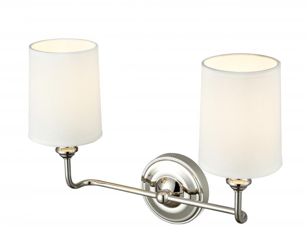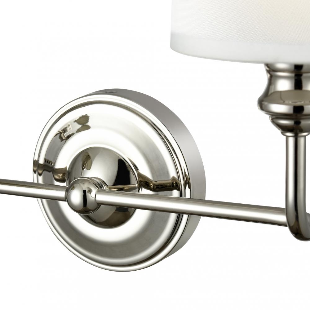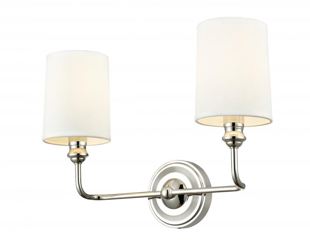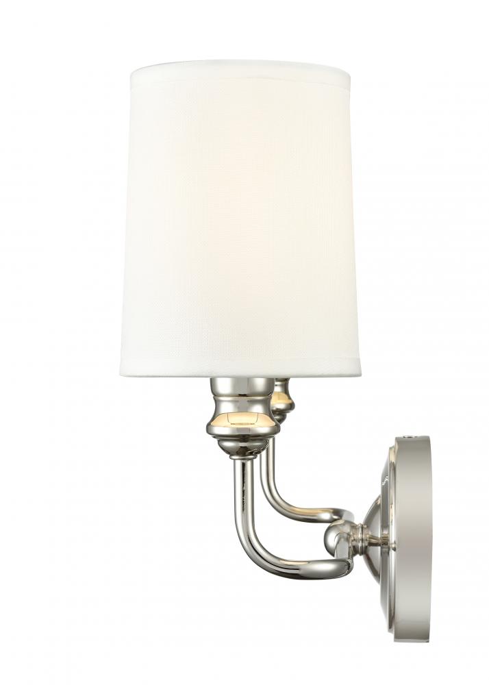 The Leena Family of sconce lighting is reminiscent of vintage candleholders influenced by Early American design. Finished in matte black, polished nickel, or vintage brass, the sconces are available as 1-, 2-, and 3-light options. These classic fixtures are finished with white fabric shades for a warm glow and are perfect for hallway, bath, or bedroom.
