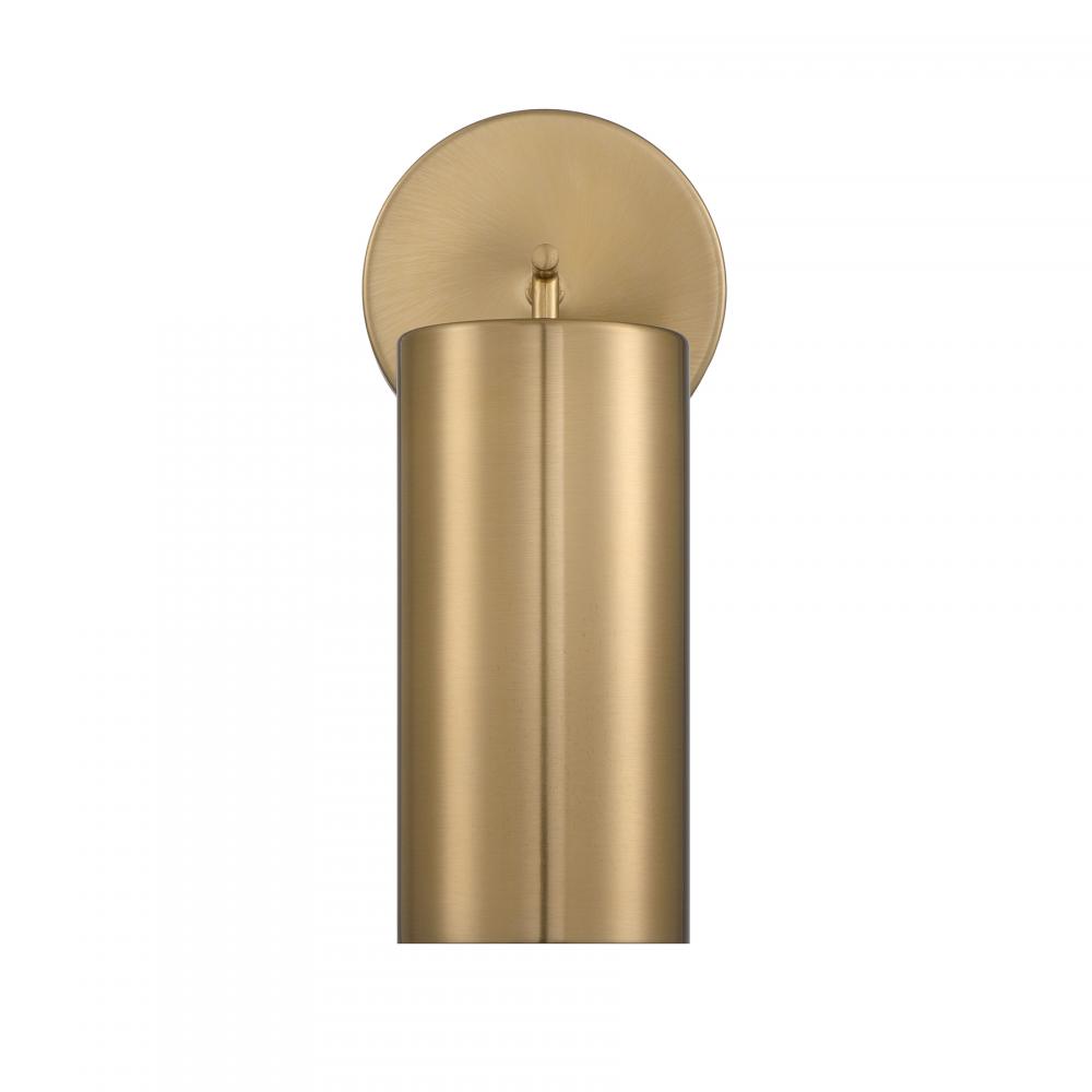 The Savoy House Lio 1-light sconce is part of Moderne by Breegan Jane, bringing her signature approachable modern luxury style to your home. Breegan loves the timeless, elevating beauty of brass, as seen in this sleek and chic design. A bold solid metal cylinder finished in champagne-toned Noble Brass holds a light that creates a concentrated and dramatic lighting look. Lio is 12" in height, 5" in width and extends 5.5" from the wall. Uses one standard size bulb of up to 60 watts. The bulb is not included. Damp area rated.