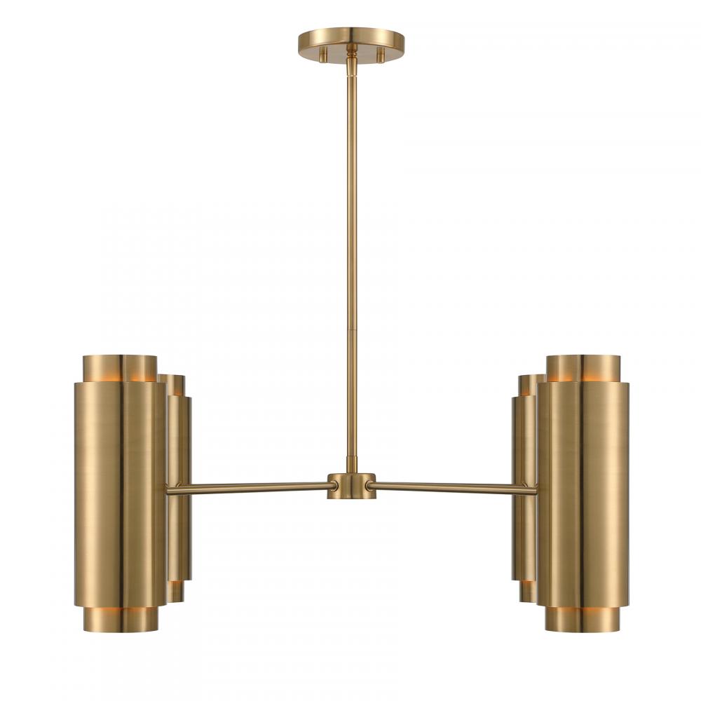The Savoy House Lio 8-light chandelier is part of Moderne by Breegan Jane, bringing her signature approachable modern luxury style to your home. Breegan loves the timeless, elevating beauty of brass, as seen in this sleek and chic design. Bold solid metal cylinders finished in champagne-toned Noble Brass hold lights that shine out above and below to create a concentrated and dramatic lighting look. Lio is 31" in width and has an adjustable height ranging from 11.5" to 65.5". Comes with four 12" downrods and one 6" downrod. Uses eight candelabra size bulbs of up to 60 watts per bulb. Bulbs not included.