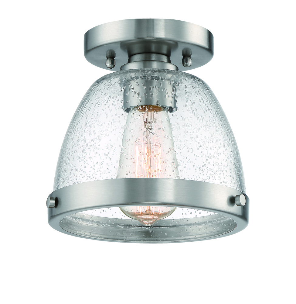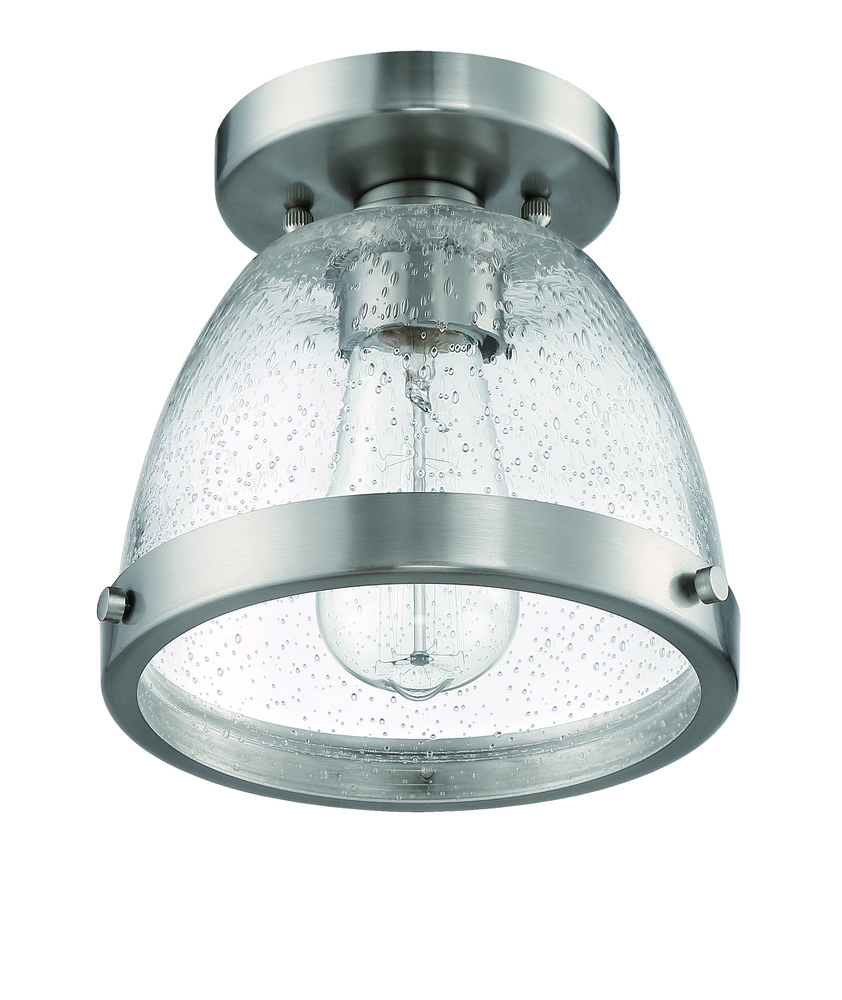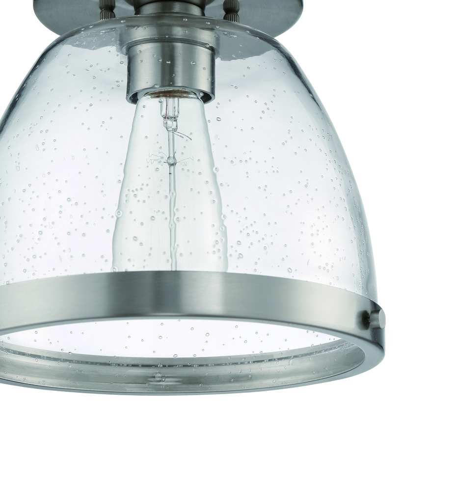 Light illuminates the clear seeded glass shade of these flushmounts from our Lodie Collection . Featuring two sizes offered in three finishes, the Lodie Flushmount Collection offers the clean transitional styling and excellent light without all the fuss.