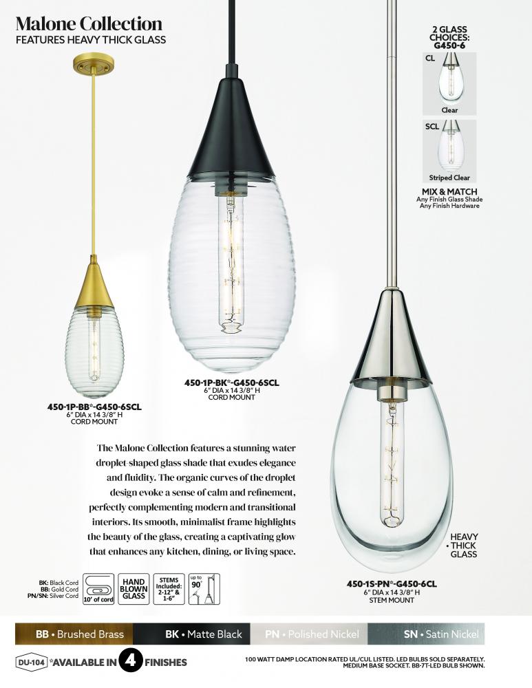 Malone - 1 Light - 6 inch - Brushed Brass - Clear Shade - Pendant