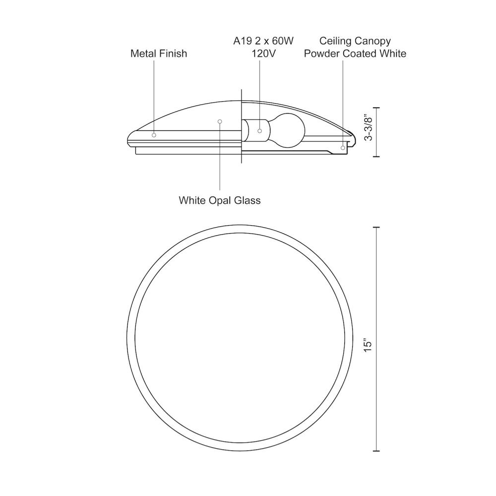 Two lamp flush mount ceiling fixture with white opal glass and your choice of brushed nickel or chrome metal finish.