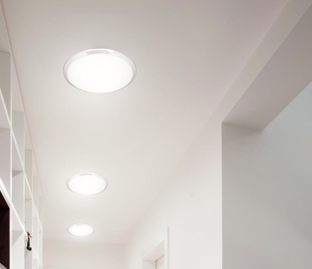 Single lamp flush mount ceiling fixture with white opal glass and your choice of brushed nickel or chrome metal finish.