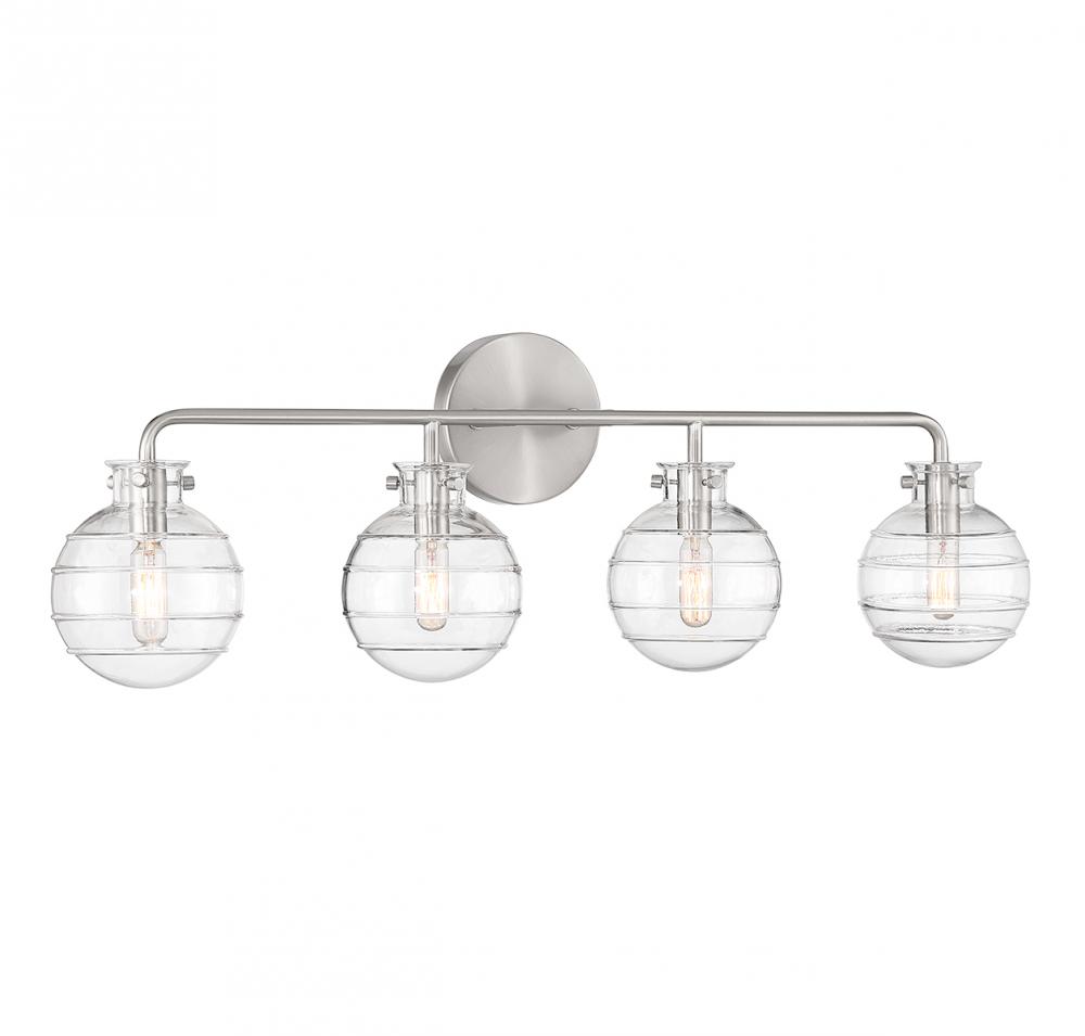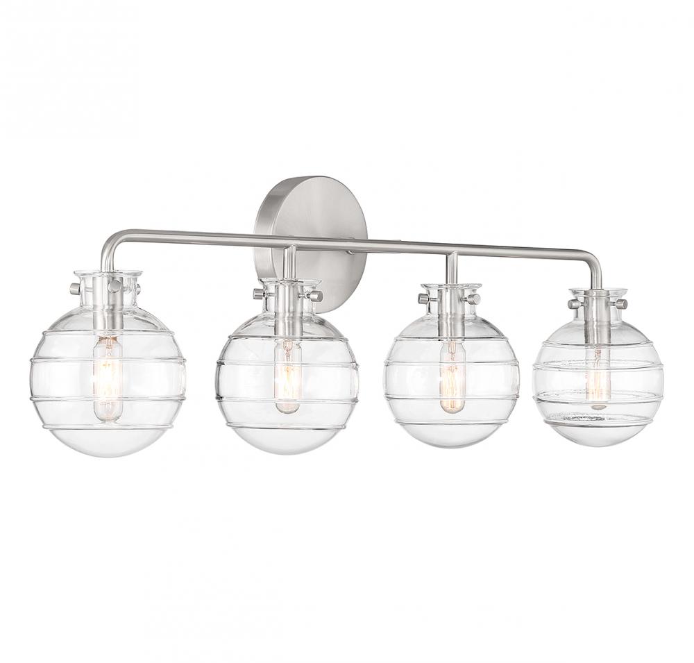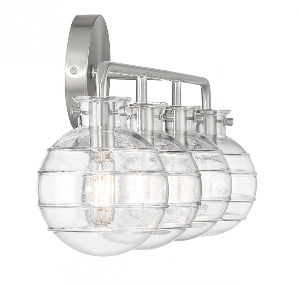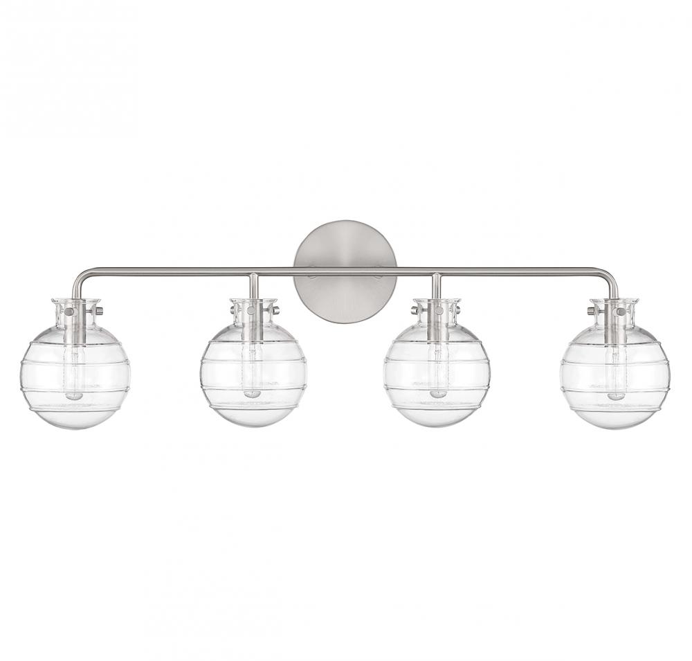 Create a textural, intriguing look with the Savoy House Mason 4-light bath vanity light. Clear swirl glass orbs take center stage in a streamlined design that has a satin nickel finish. Mason is 10" in height, 30.5" in width and extends 6.25" from the wall. It uses four candelabra size bulbs of up to 60 watts per bulb (bulbs not included).