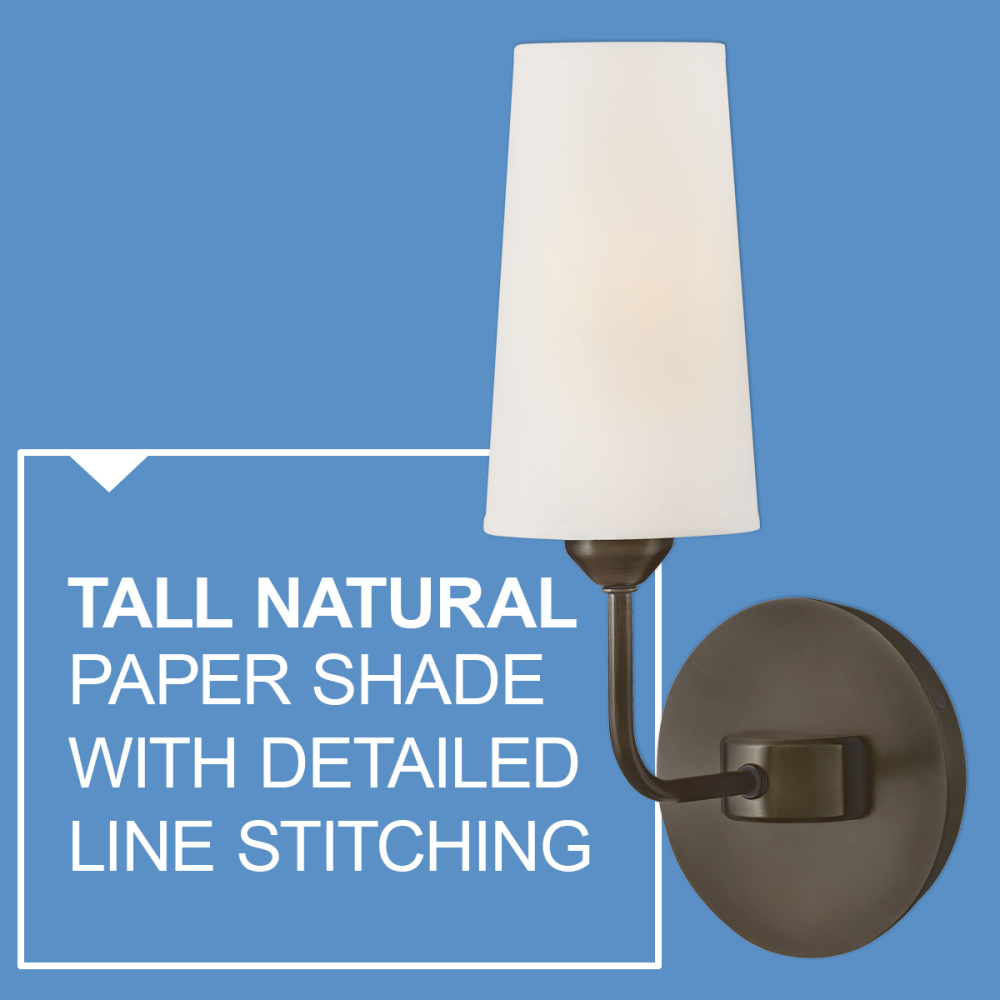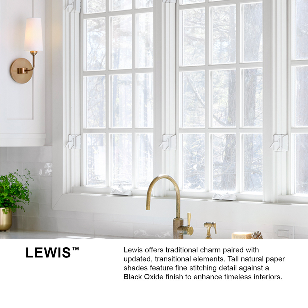 Lewis offers traditional charm paired with updated, transitional elements. Tall natural paper shades feature fine stitching detail against a Heritage Brass or Black Oxide finish to enhance timeless interiors.