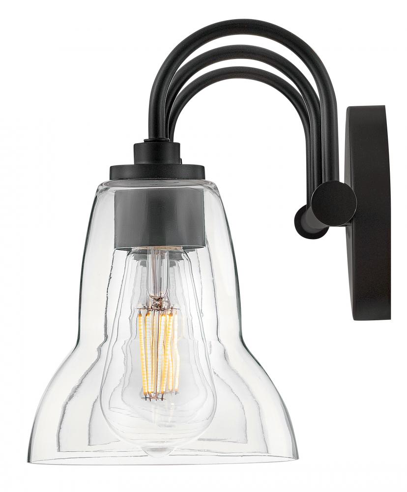 Vera’s unique, shapely form takes the traditional bell-shaped shades to a new level. Plenty of light shines up or down from the clear glass, making it a functional choice for main baths and powder rooms alike. Finished in Black or Lacquered Brass, Vera’s chic profile brings transitional style to any space.
