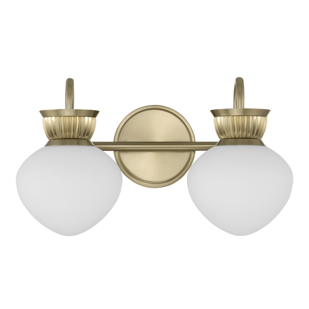 Early 20th-century lighting style shines anew in the Savoy House Melbourne 2-light bath vanity light. Shades of white opal glass meet classic ribbed detailing and gracefully arched arms, all wearing a beautifully adaptable Noble Brass finish. Melbourne is 9.25" in height, 16" in width and extends 7.5" from the wall. Uses two candelabra size bulbs of up to 60 watts per bulb. Bulbs not included. Can be mounted with shades facing up or down.