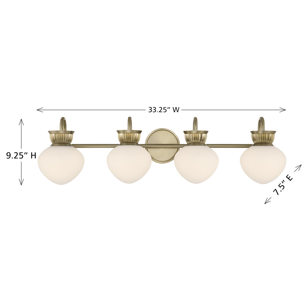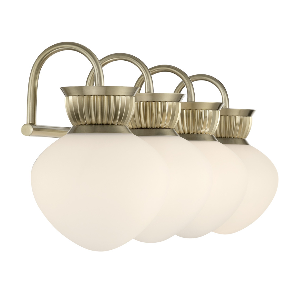 The Savoy House Melbourne 4-light bath vanity light brings early 20th-century inspiration into the modern era with white opal glass shades, subtle ribbed detailing and elegantly curved arms. Its Noble Brass finish lends warmth and sophistication, making it a refined choice for today’s baths. Melbourne is 9.25" in height, 33.25" in width and extends 7.5" from the wall. Uses four candelabra size bulbs of up to 60 watts per bulb. Bulbs not included. Can be mounted with shades facing up or down.