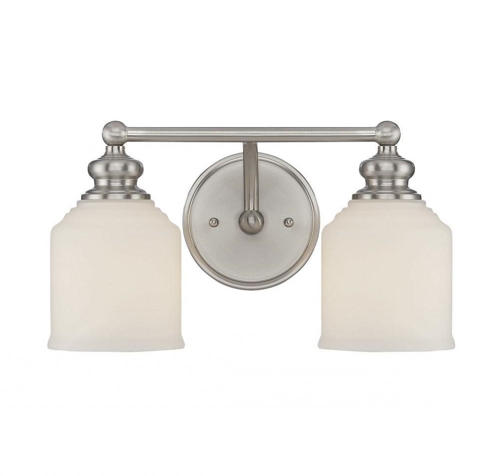 From Savoy House, the Melrose 2-light bath vanity bar stylishly updates classic Americana design for today's interiors. It features modern lines, white opal glass shades and a satin nickel finish. It may be mounted as either uplight or downlight. Bath bar lights are a classic choice for illuminating vanity mirrors in bathrooms big and small. The satin nickel finish can be paired with nickel hardware or mixed with hardware in other finishes. Bring Melrose into bathrooms of traditional, transitional or classic style to improve the look and the lighting. When you choose a Savoy House lighting fixture, you can be certain you’ve selected a piece that will withstand the test of time.