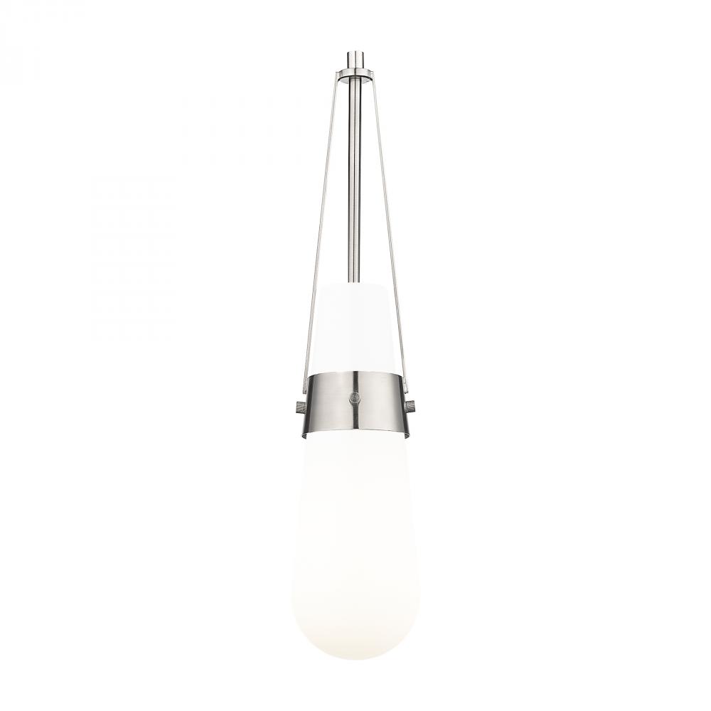 The Milan pendant reinvents the teardrop form with contemporary shapes and modern metal accents. The heavy glass bulb is held in place by a metal band with heavily detailed screws. Suspended from a tapered frame and featuring a single filament bulb, the M