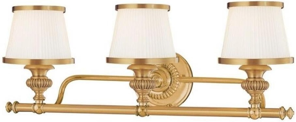 The circular nose of a 19th-century locomotive lends inspiration to Milton’s decorative backplate. Smooth metal rails support intricately tooled lamps, which we cap with opal glass shades. The shades are pressed to resemble pleated fabric and trimmed with contrast metal piping. Milton’s attractive details add historic character to any well-appointed space.