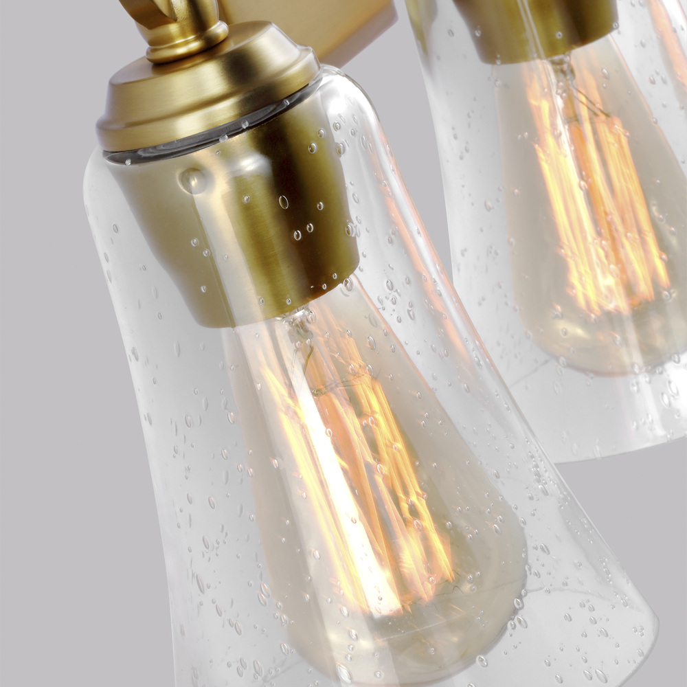 The Sean Lavin Monterro three light vanity fixture in burnished brass offers shadow-free lighting in your powder room, spa, or master bath room. Monterro features beautiful tapered glass shades and exquisite cast details, including a cast backplate, cast ring, and hook hardware that elegantly supports the shades. The Chrome version is available with two glass options; either White Opal Etched glass or Clear Seeded glass, while the Burnished Brass, Satin Nickel finish is available in Clear Seeded glass only.