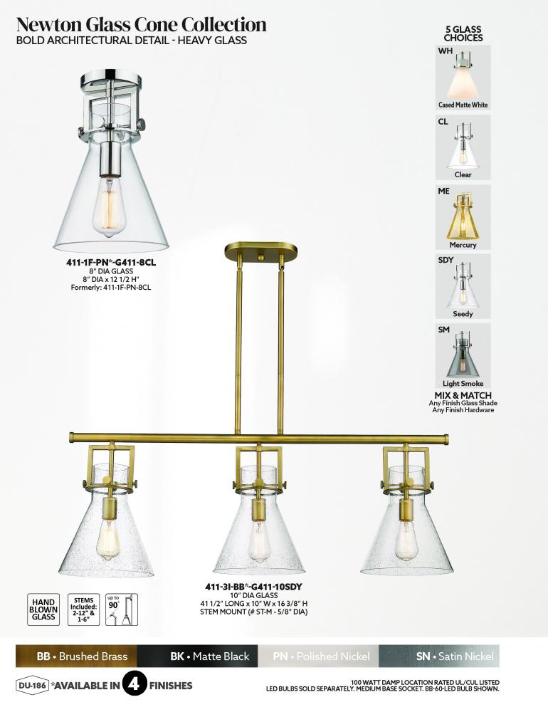 The Newton collection fixtures are beautifully crafted restoration inspired fixtures. The extraordinarily thick clear glass shades and heavy spun metal shades are offered in four distinctively elegant designs. The Newton Collection features an assortment o