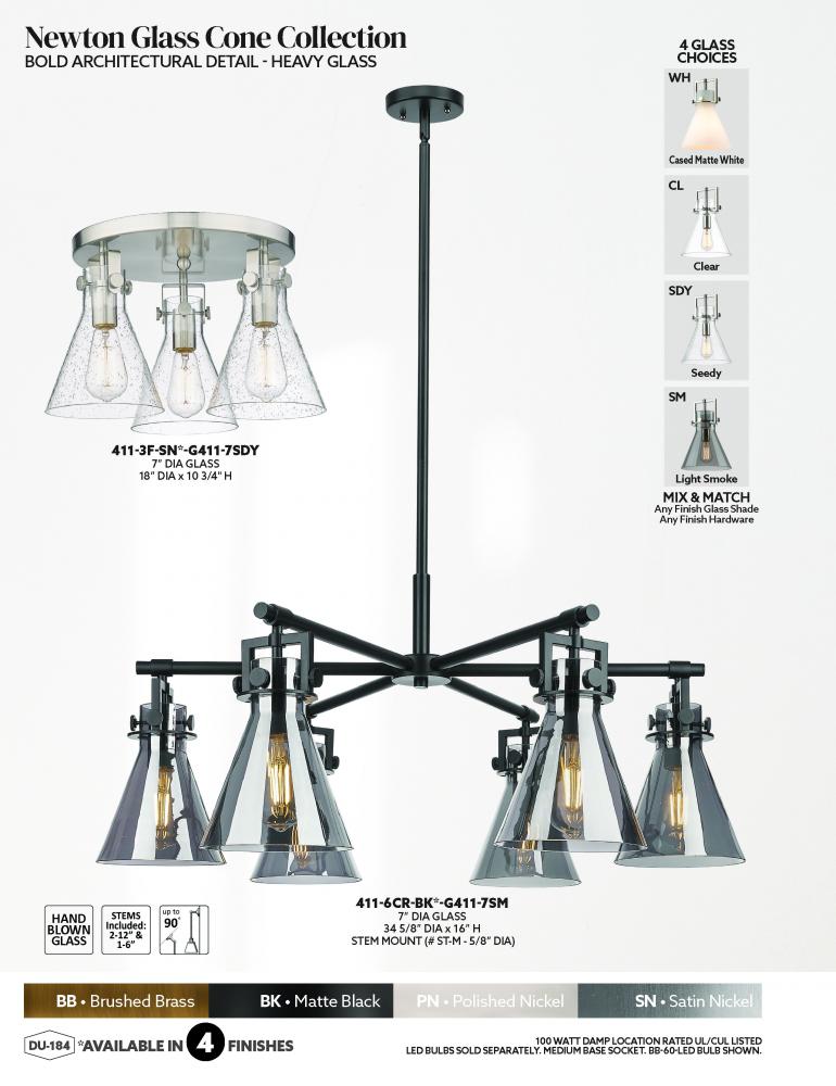 The Newton Cone is a modern industrial collection that incorporates exceptional architectural details and an equally striking cone shaped shade. The geometric shape of the glass or metal shade give this collection a charming and timeless presence.