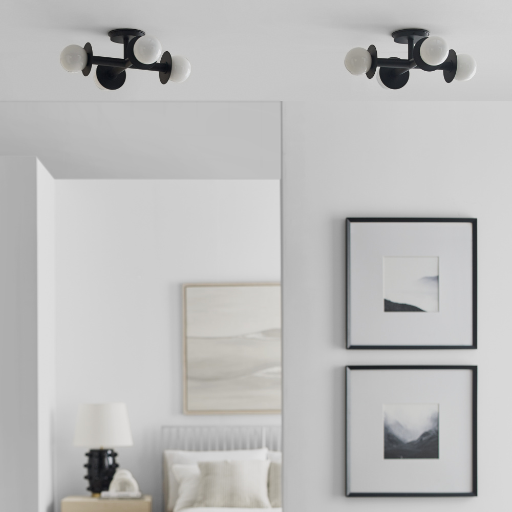Nodes task, ceiling and wall lighting is minimal yet bold, highlighting Kelly's distinctive juxtaposition of mixed-materiality and curvilinear form. Light radiates from milk glass globes set against metal discs. All fixtures can be used or without the discs. The cast canopy is available in Burnished Brass or Midnight Black. Hanging fixtures within this family feature black fabric cords, while pivot sconces can be cord and plug or hard wire.