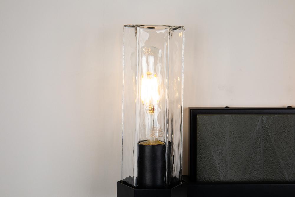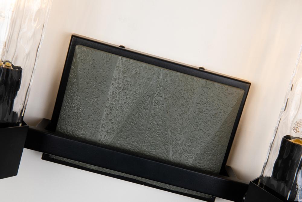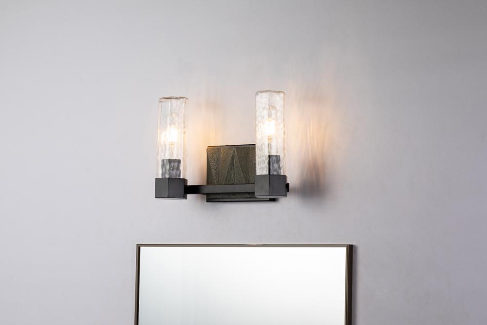 A 14" x 9" x 4.5" black metal 2-light vanity with a grey textured backplate and water glass shades. Ideal for damp bathrooms with warm, contemporary light.