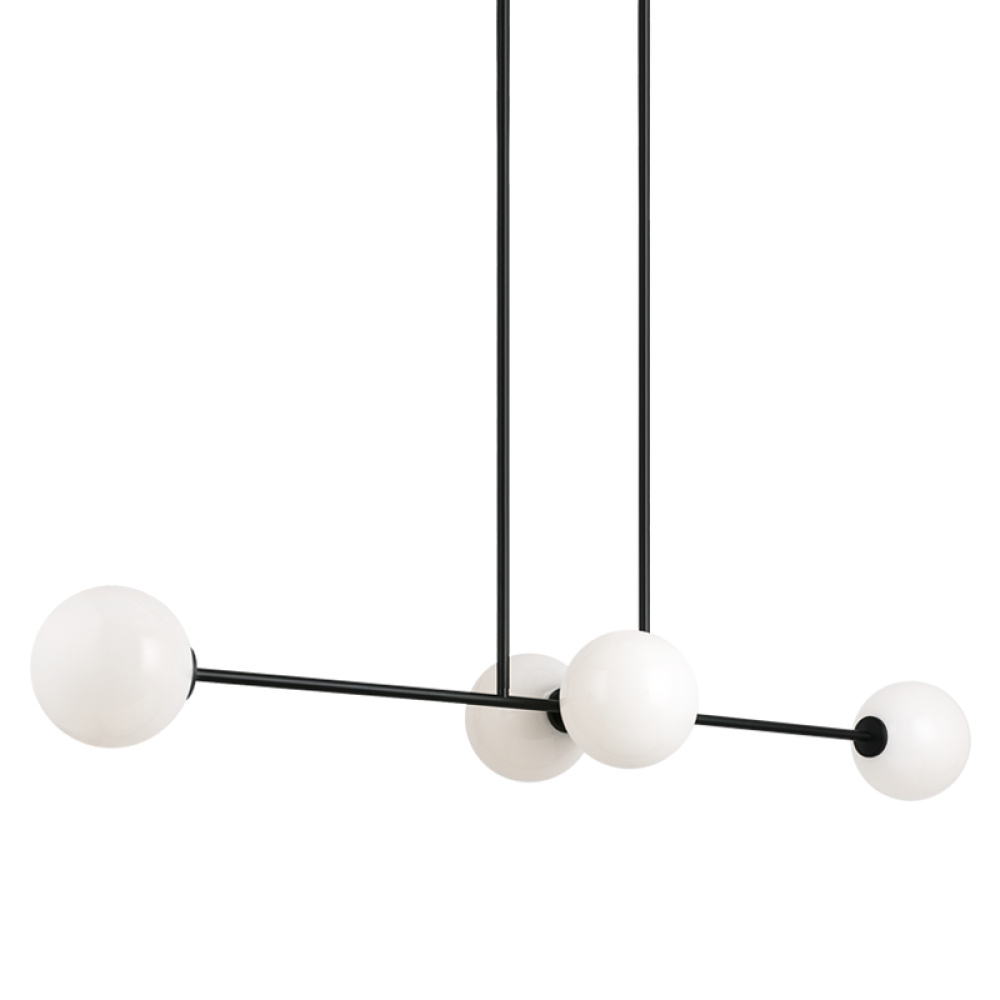 Novo is modern yet classic – available in the form of chandelier, wall sconce, and flush mount. The rods and base are either Aged Gold Brass or Black finish paired with a contrasting Opal Glass. The style is very versatile and will add beauty to multiple rooms.