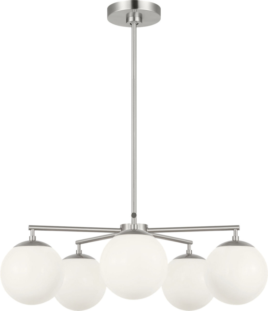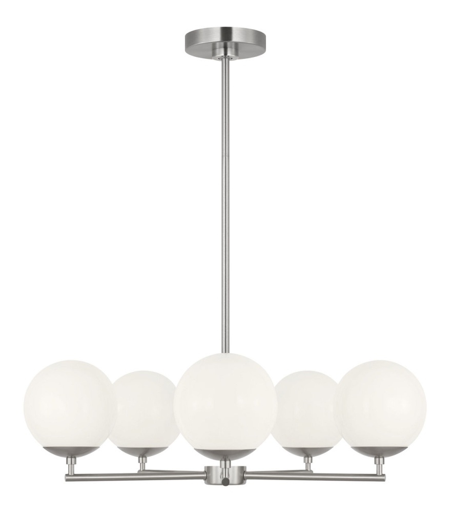 The Nube 5?Light Chandelier presents five milk glass globes arranged around a minimalist central hub. Its reduced scale retains the airy aesthetic of larger variants while suiting dining rooms, foyers, or smaller living areas. The design emphasizes negative space, letting the spheres feel weightless and unobstructed.