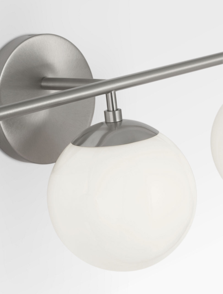 The Nube Vanity fixtures reinterpret the floating globe motif for wall-mount use. Whether in the 1?Light, 2?Light, or 3?Light format, milk glass spheres appear to hover just beneath a horizontal bar mounted to the wall plate. Designed for bathrooms, powder rooms, or corridor lighting, the vanity series provides flattering illumination at face height while maintaining the airy silhouette of the chandelier variants.