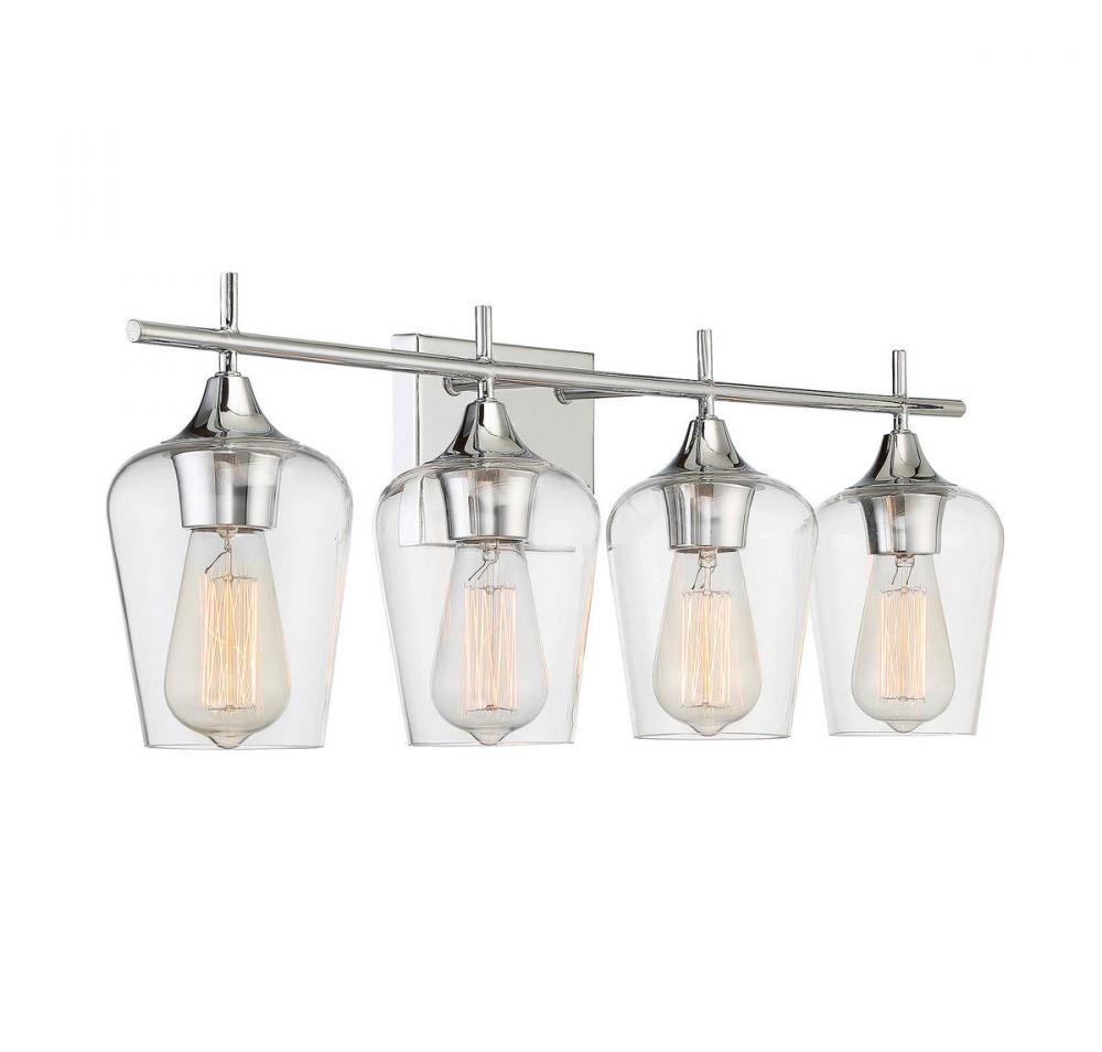 The Octave 4-light bath bar from Savoy House has understated elegance. It features large curved shades of clear glass, minimal detailing and a polished chrome finish. It may be mounted as either uplight or downlight. Bath bar lights are a classic choice for illuminating vanity mirrors in bathrooms big and small. Because the bulbs are exposed, try using stylized bulbs (not included) such as Edison for a different look! The polished chrome finish can be paired with chrome hardware or mixed with hardware in other fixtures. Try the Octave with glam, transitional or contemporary style rooms for a chic look. When you choose a Savoy House lighting fixture, you can be certain you've selected a piece that will withstand the test of time.