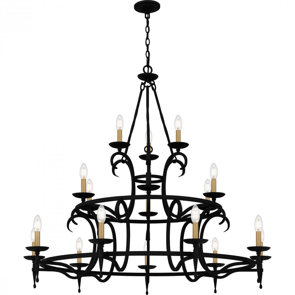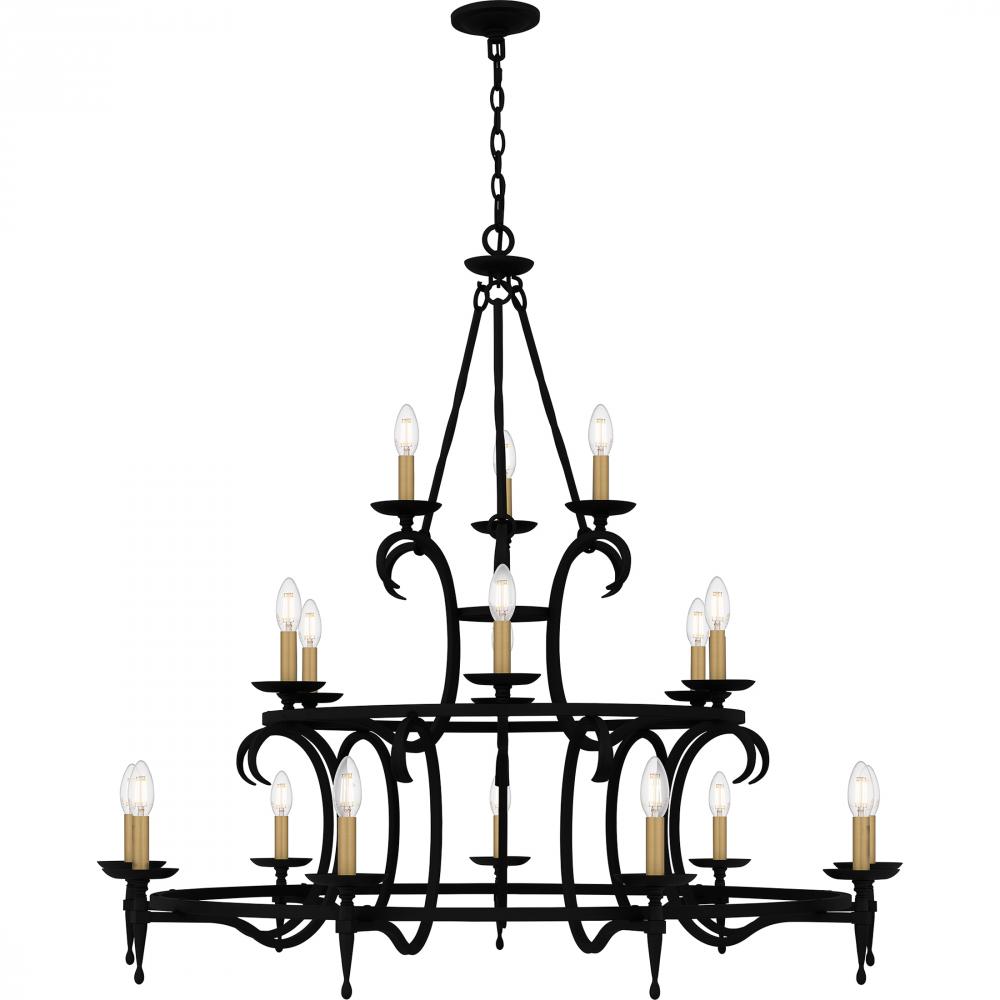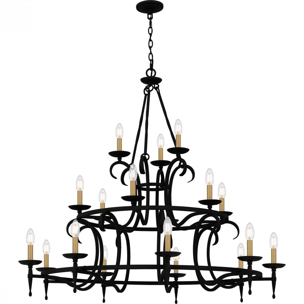Elegant scrollwork and aged brass accents make Octavia a standout in any room. The earth black silhouette features delicately curving arms and aged brass candle sleeves for a pop of shimmering gold. Octavia is available as a chandelier or wall sconce, and