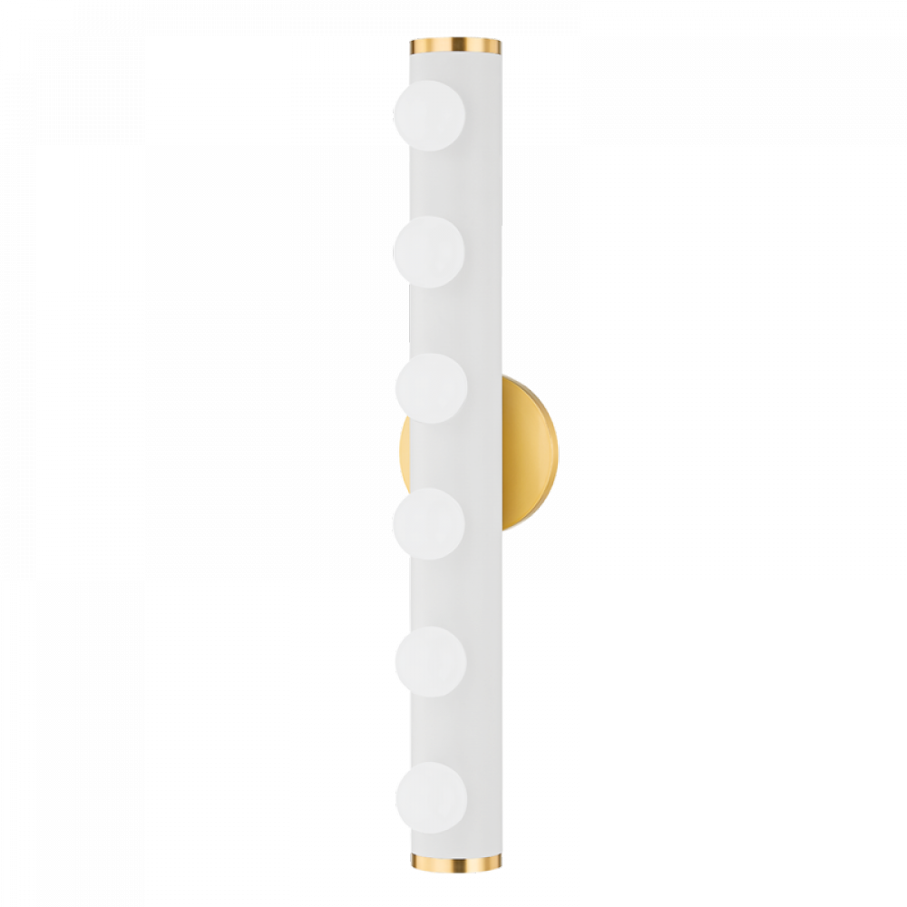 Penny gives familiar Hollywood-style lighting a fresh feel. Small opal matte globes spread across a cylinder of textured white or textured black for a glamorous look that provides ample bright light. An aged brass backplate and decorative end caps give the fixture a fun, updated look. With the ability to mount horizontally or vertically, Penny makes perfect sense over or alongside the vanity in the bath.