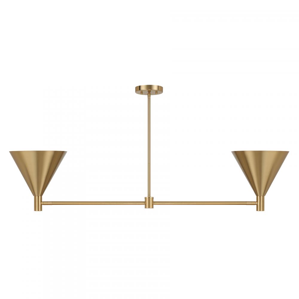The Savoy House Pharos 2-light linear chandelier is part of Moderne by Breegan Jane, bringing her signature approachable modern luxury style to your home. Breegan loves how metallics elevate a design, as exemplified by the opaque metal shades finished entirely in champagne-toned Noble Brass. The shades can be adjusted, providing different angles of light to meet your needs. Pharos is 50" in length, 10" in width and has an adjustable height ranging from 11" to 65". Comes with four 12" downrods and one 6" downrod. Uses two candelabra size bulbs of up to 60 watts per bulb. Bulbs not included.