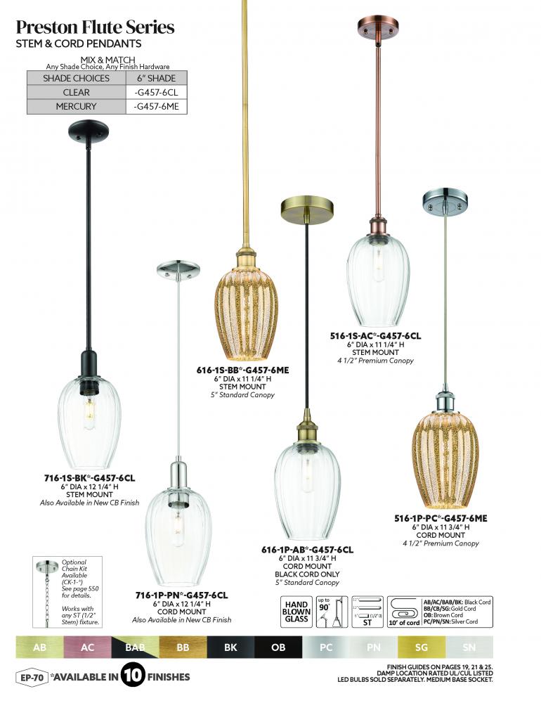 Preston Flute - 1 Light - 6 inch - Antique Brass - Mercury Preston Flute Shade - Cord hung - Mini Pendant