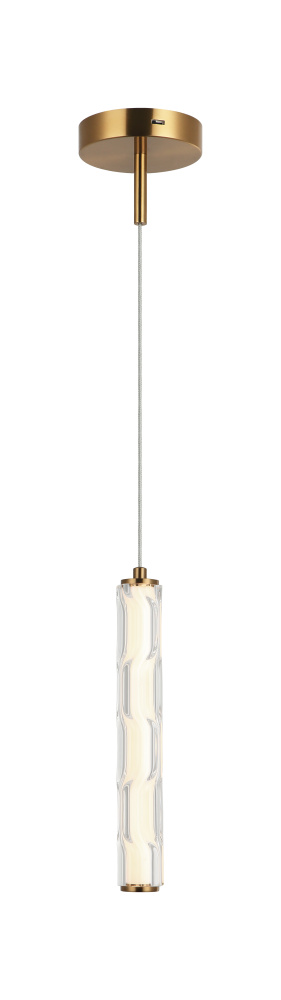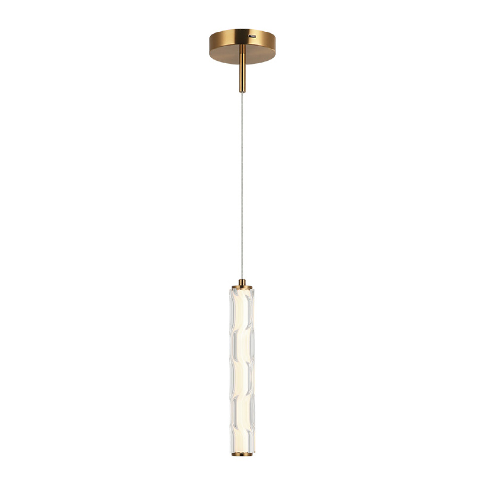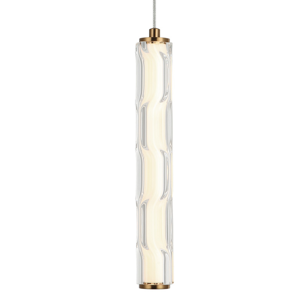 This family features a sleek, modern design with a vertically oriented, elongated cylindrical glass shade that has a wavy, textured surface. The inner 5CCT LED light diffuses through the contoured glass, giving off a soft glow that plays beautifully with the curves adding visual interest and depth. Comes in Aged Gold Brass and Matte Black.