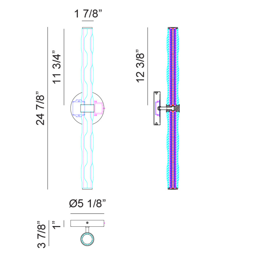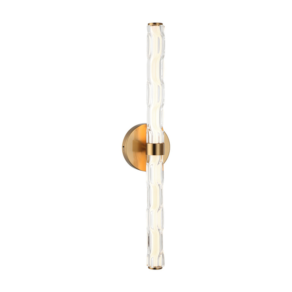 This family features a sleek, modern design with a vertically oriented, elongated cylindrical glass shade that has a wavy, textured surface. The inner 5CCT LED light diffuses through the contoured glass, giving off a soft glow that plays beautifully with the curves adding visual interest and depth. Comes in Aged Gold Brass and Matte Black.