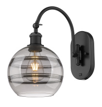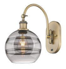 the arm swivels side to side at the base and the solid brass 180 degree adjustable swivel at the top of the socket has internal teeth that lock in at 5 degree intervals and allows for up and down tilting of the shade