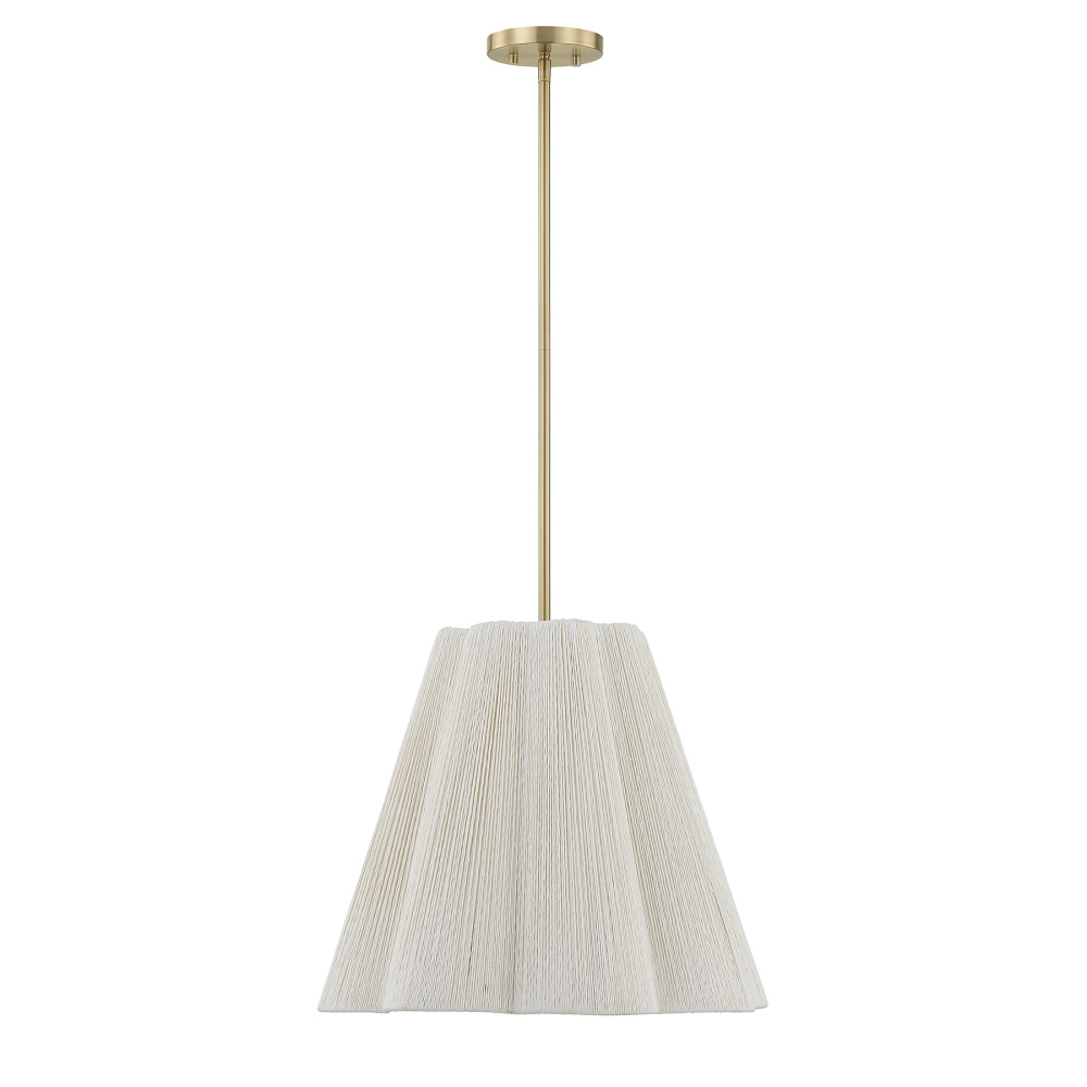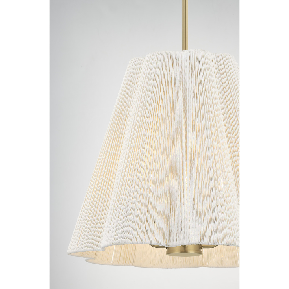The Savoy House Rosa 4-light pendant was designed by award-winning interior designer and TV host Breegan Jane. Like an unfurling flower, its scalloped white string shade creates layers of soft texture and airy dimension, bringing a quiet, organic elegance to any room. The Noble Brass finish introduces a warm, golden glow that complements the serene silhouette. Rosa is 18.5" in width and has an adjustable height ranging from 16" to 70". It uses four candelabra size bulbs of up to 60 watts per bulb. Bulbs not included. Comes with four 12" downrods and one 6" downrod.