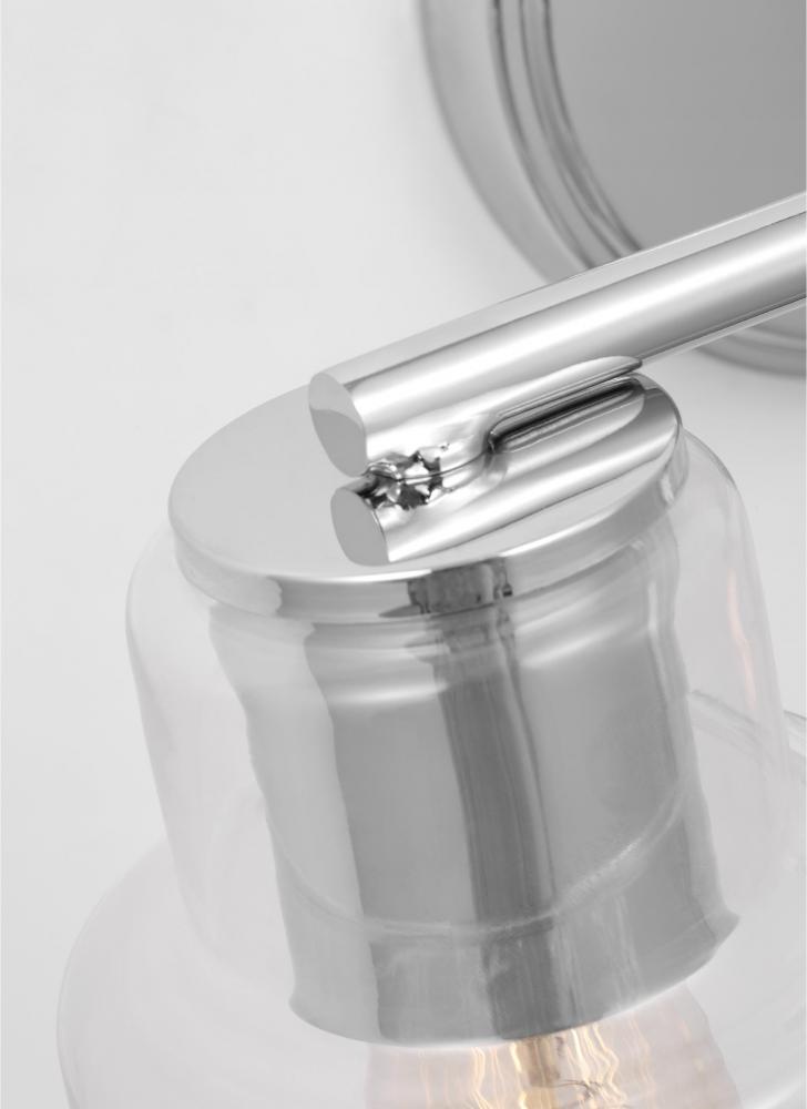 Add a bright burst of light where you need it most with the classic Drew & Jonathan Sayward Two Light Wall / Bath Sconce, featuring a round metal backplate and clear glass shades. Made to coordinate across a broader range of bath hardware and design styles, the Sayward is available in four popular finishes, Brushed Steel, Chrome, Midnight Black, and Satin Brass. This light looks great on its own or installed above a bathroom vanity, and the glass shades make it ideal for filament bulbs. This fixture may be mounted in the up or down position, and is cETL listed for damp locations, making it the perfect lighting solution for any space.