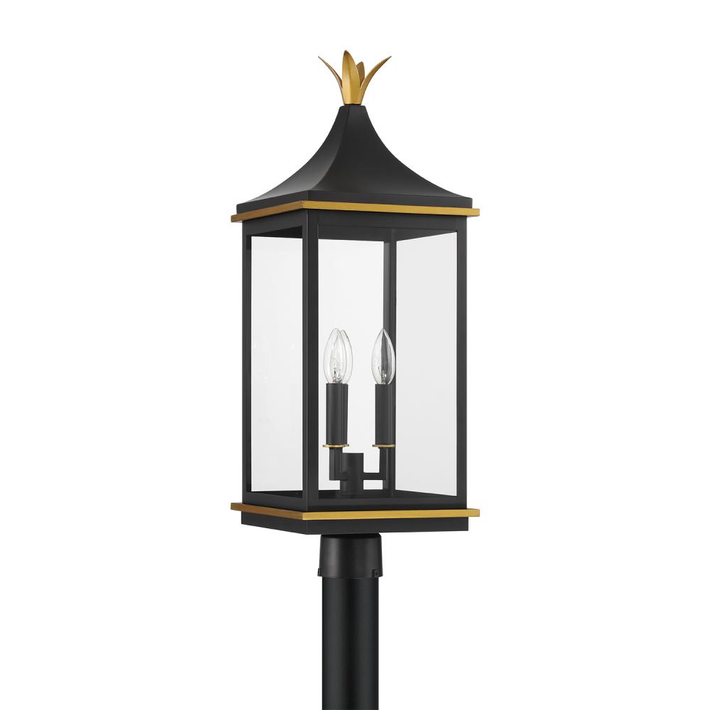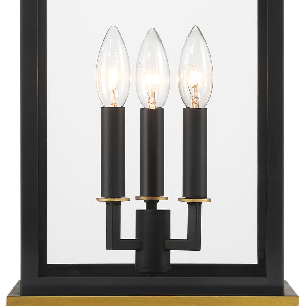 The Simpson Outdoor Collection features a lantern-style design with a two-tone finish. Its elongated rectangular frame, elegant glass panels, and candelabra bulbs create a classic look with a contemporary edge. The collection includes two options for customizing the top: a gold crown cap for a traditional flair or a sleek angled loop for a more contemporary appearance. This versatile design adds a stylish touch to any outdoor setting.