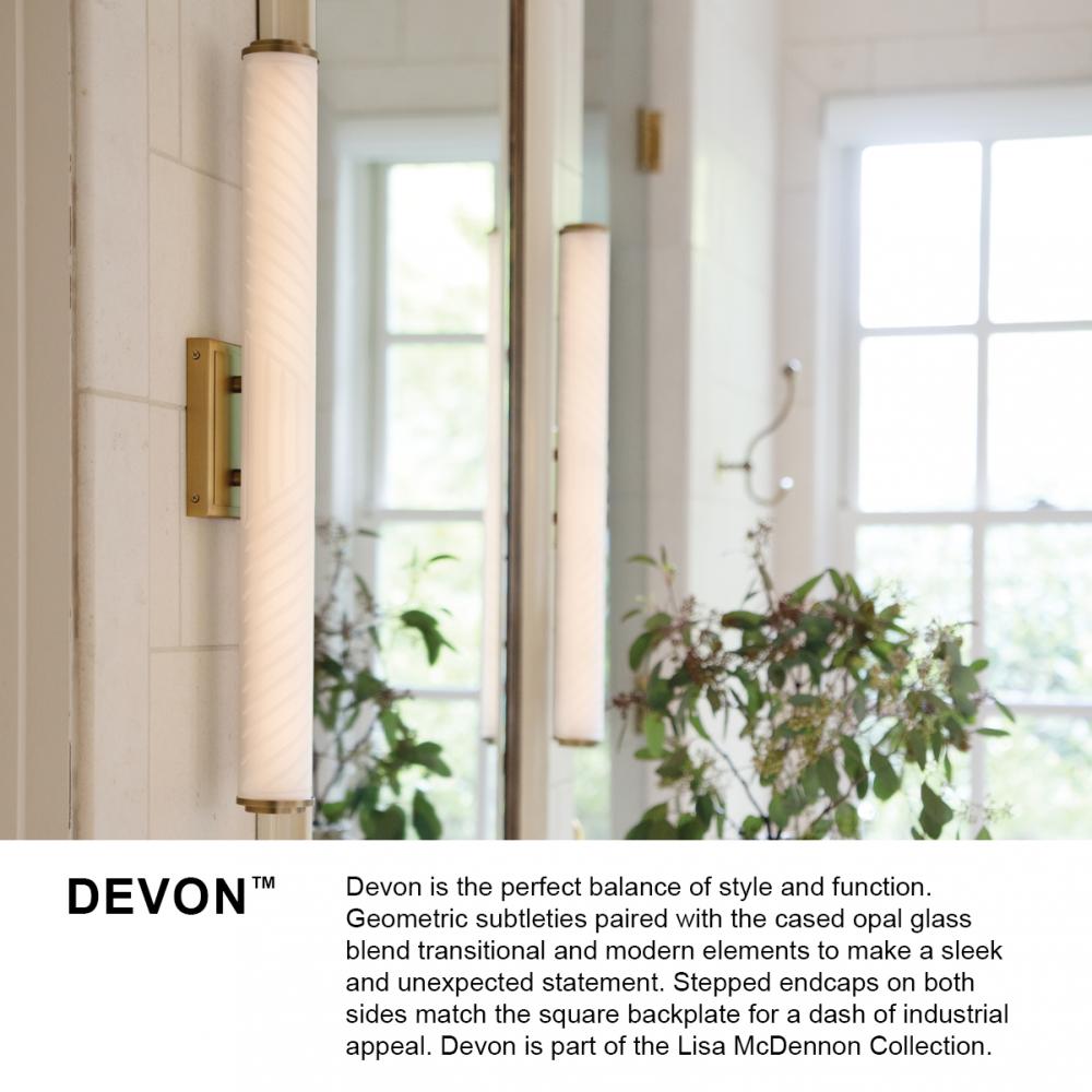 Devon is the perfect balance of style and function. Geometric subtleties paired with the cased opal glass blend transitional and modern elements to make a sleek and unexpected statement. Stepped endcaps on both sides match the square backplate for a dash of industrial appeal. Devon is part of the Lisa McDennon Collection.