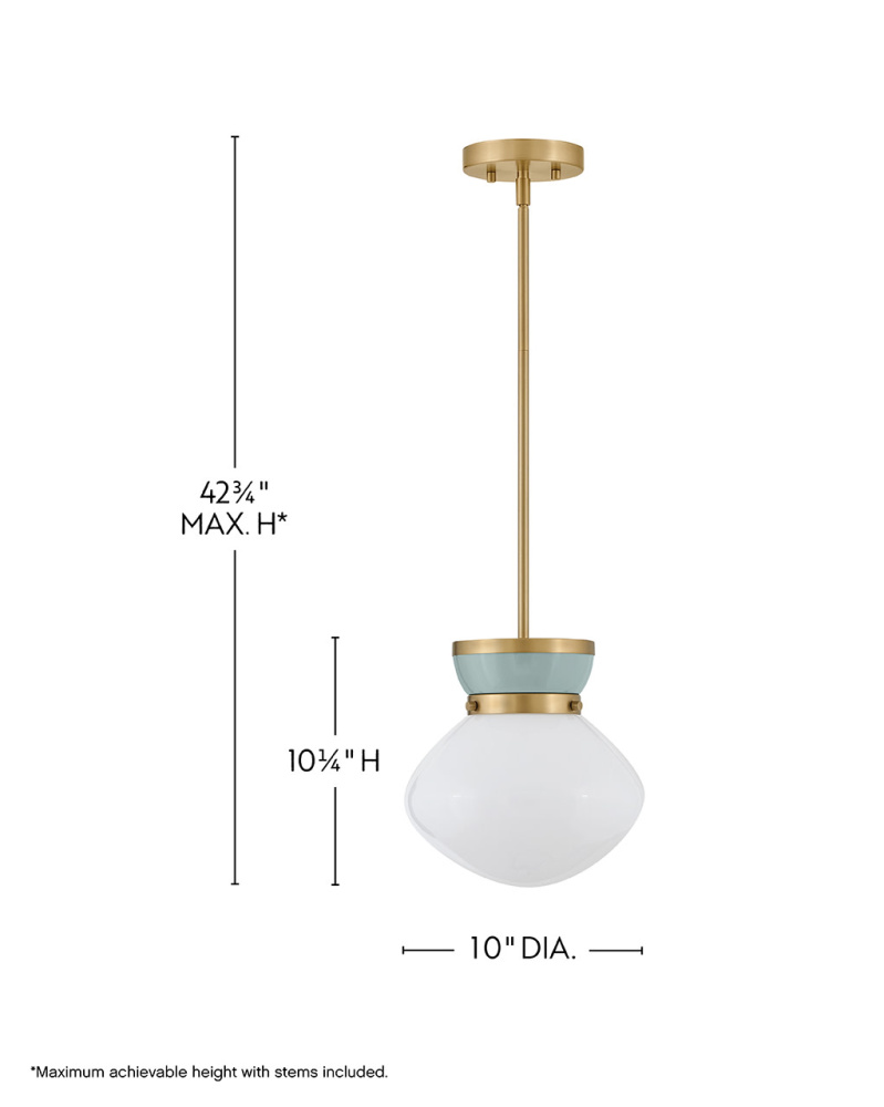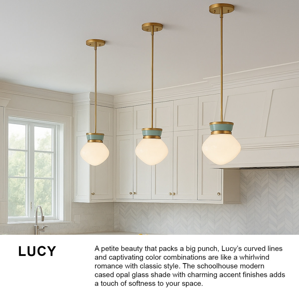 Lucy is a petite beauty that packs a big punch. The curved lines and captivating color combinations are like a whirlwind romance with classic style. The schoolhouse modern shade and bands of Lacquered Brass finish off the timeless love story with a softness that fits in any space or place.