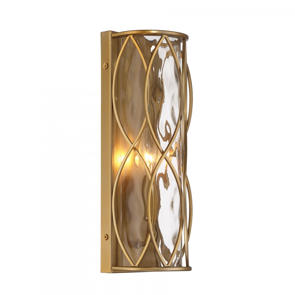 Get an unbelievably cool lighting look with the Savoy House Snowden 1-light sconce. Its tall, slim, cylindrical structure features an intricate curving design that perfectly accentuates the glacier glass shade within. Finished in Burnished Brass. Snowden is 14" in height, 4.75" in width and extends 4" from the wall. It uses a candelabra size bulb of up to 60 watts. The bulb is not included. This sconce is damp area rated.