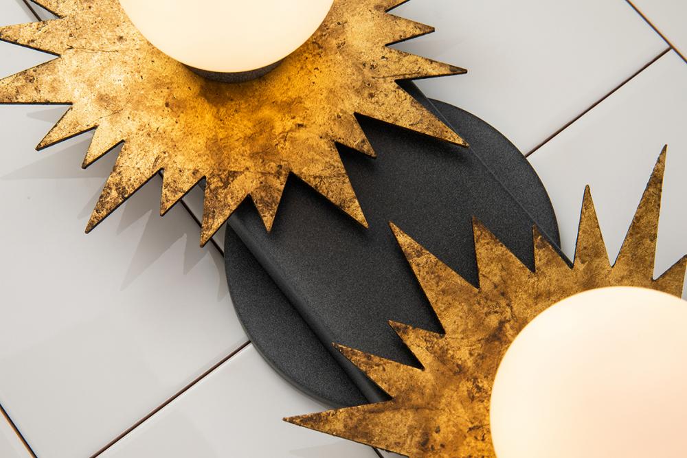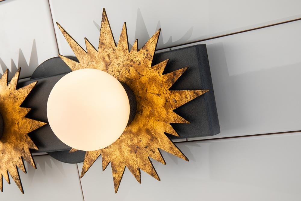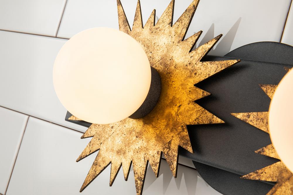 A 16" x 8.5" x 4.5" sun-shaped 2-light sconce in gold leaf and weathered black. Ideal over mirrors, it brings whimsical texture and drama to bathrooms or nooks.