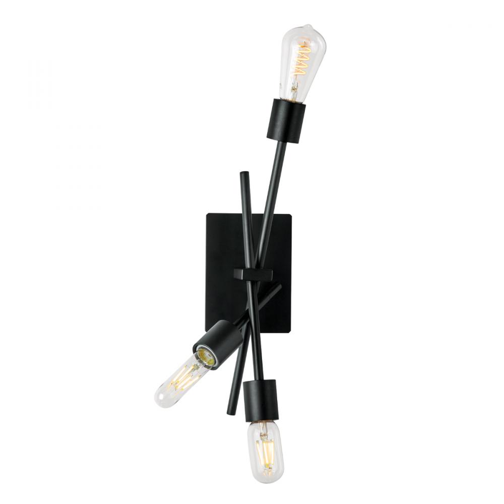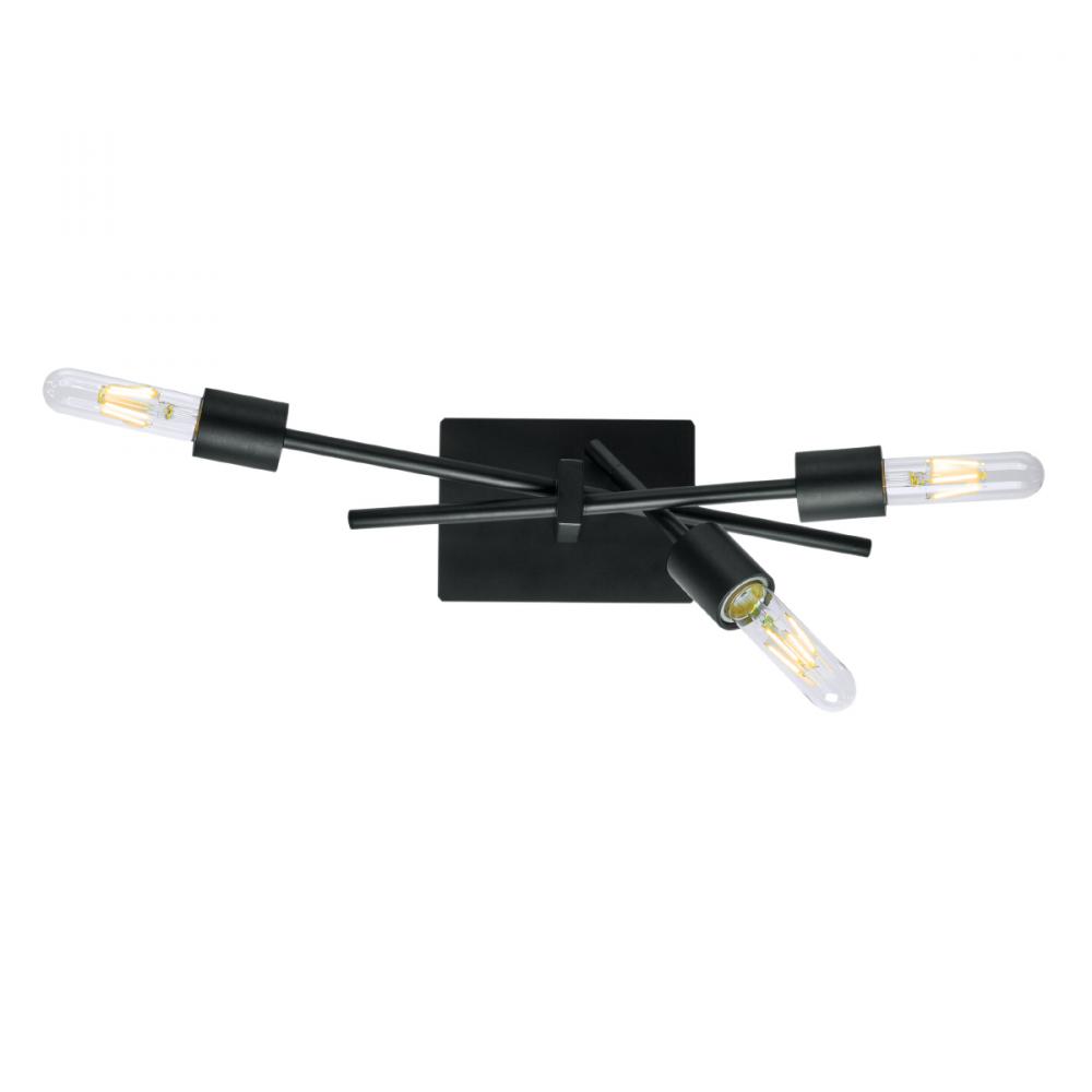 Slim edison bulbs radiate on fixed stems from a matching matte vlack back plate.