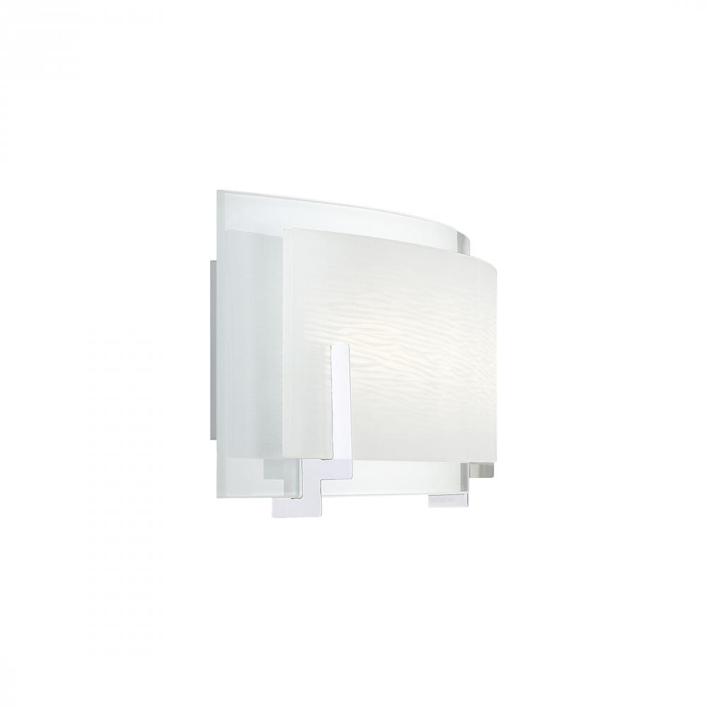 The Stream collection from Platinum by Quoizel offers integrated LED technology without sacrificing beauty. A frosted glass panel is layered behind a smaller panel printed with a whimsical woodgrain pattern. Slender brackets finished in polished chrome di