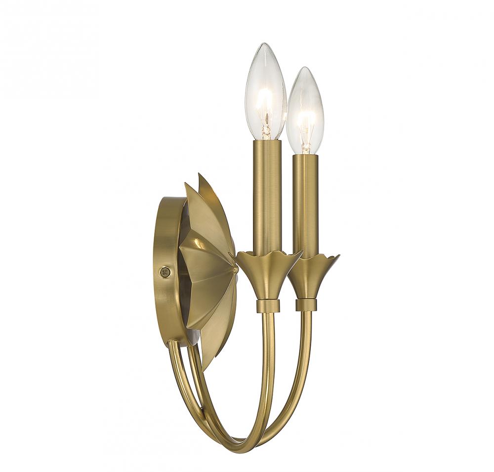 There is beauty in simplicity, as exemplified by this lovely Savoy House Sullivan 2-light wall sconce. It features a bold 8-pointed star and floral bobeche detailing, all finished in warm brass. Sullivan is 9" in height, 10" in width and extends 5" from the wall. It uses 2 candelabra size bulbs with a max of 60 watts per bulb (bulbs not included).