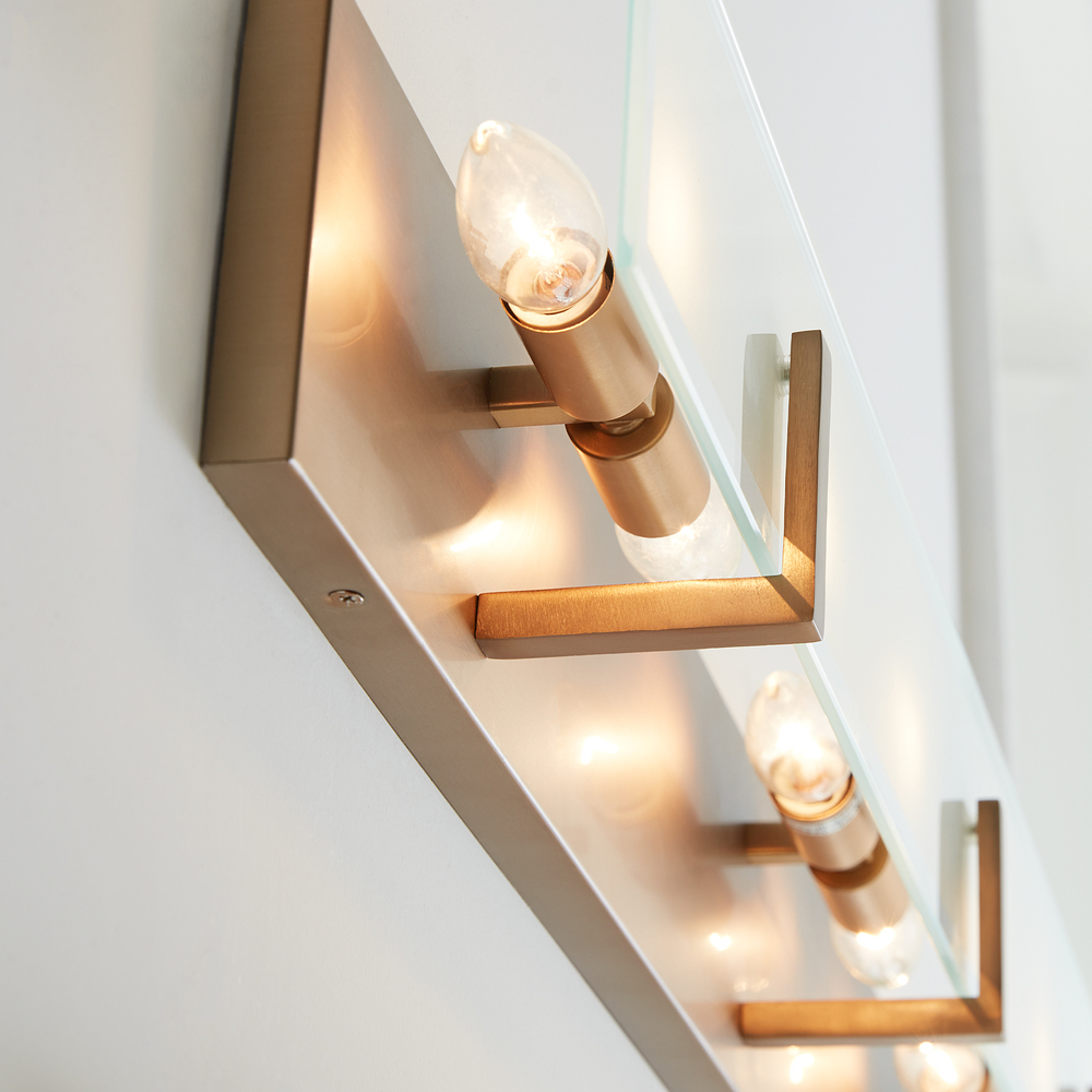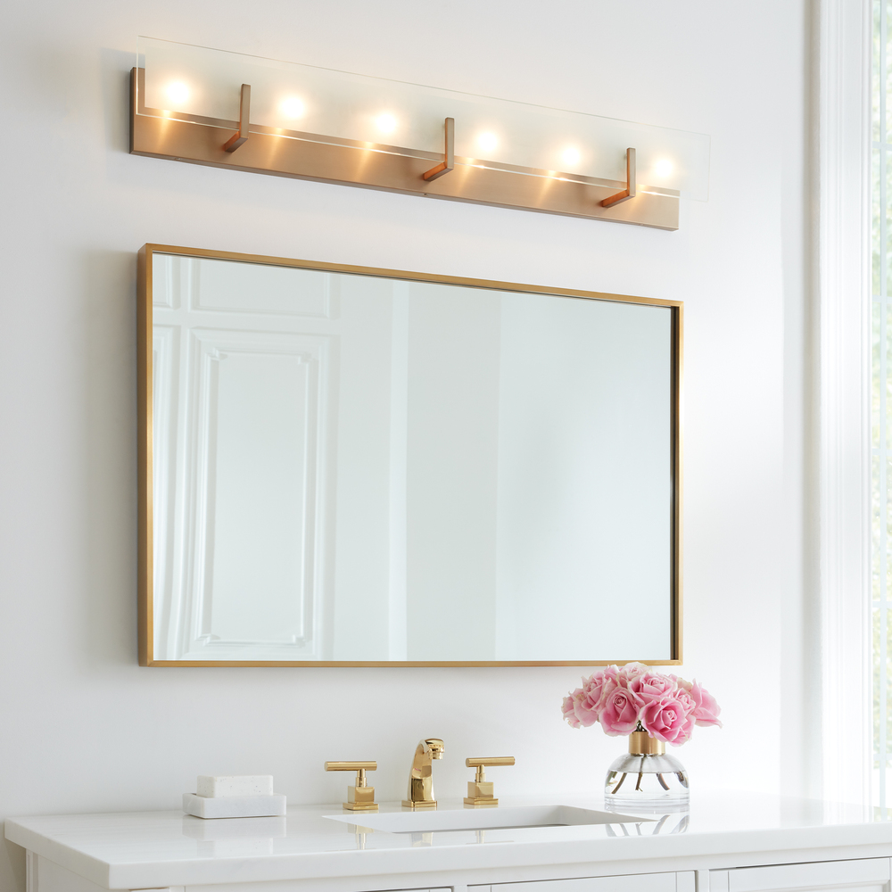 The Syll six light vanity fixture in satin brass offers shadow-free lighting in your powder room, spa, or master bath room. Syll features a stylish frame with brilliant frosted beveled glass panels.