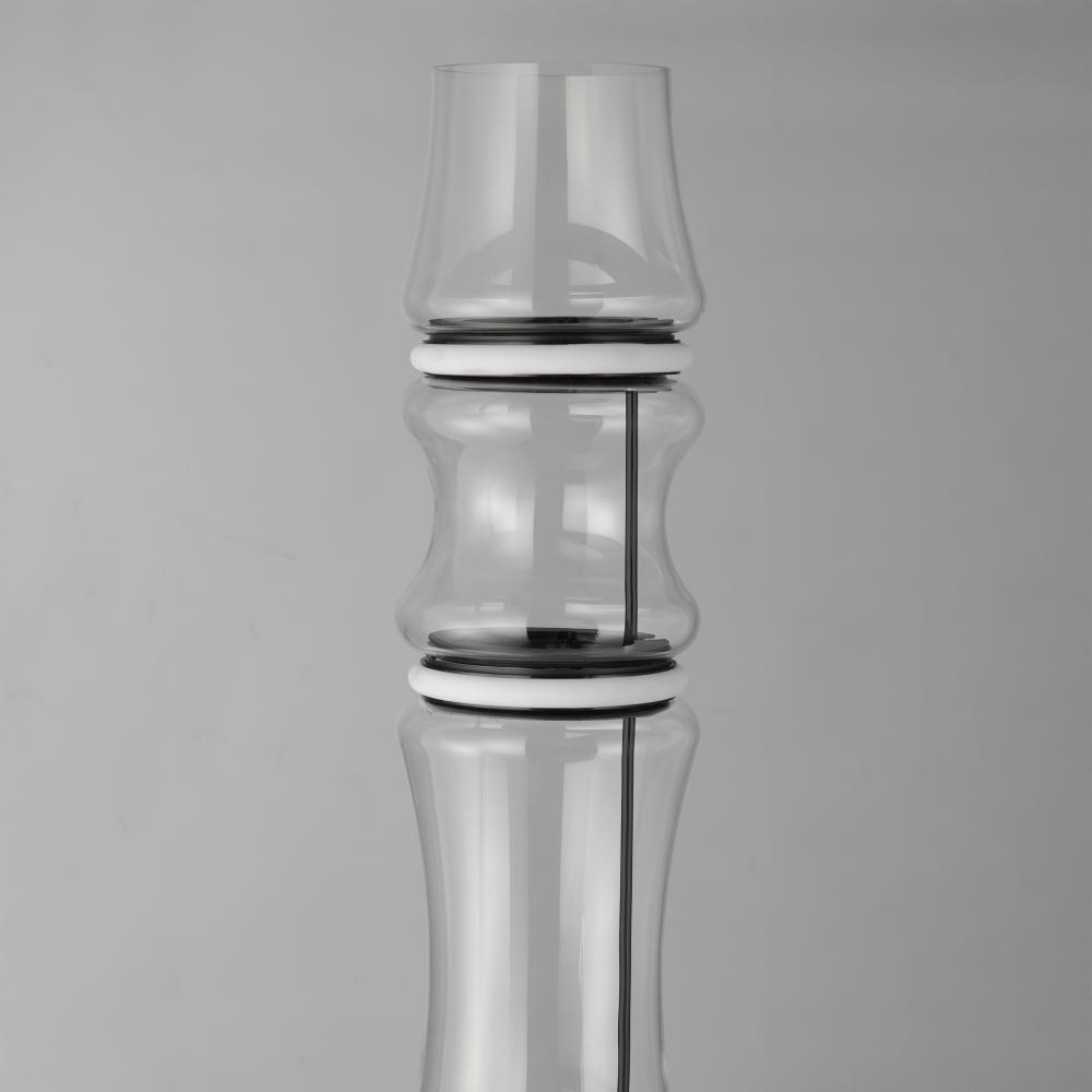 Segmented by bright LED rings finished in Matte Black, glass shades of an hourglass shape are combined into various configurations. The hand-blown glass is entirely transparent and varies in size creating an undulating pattern. All together, the series inc