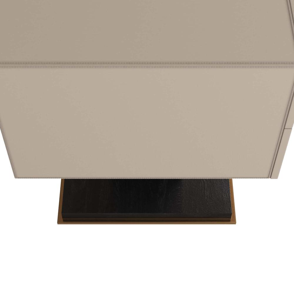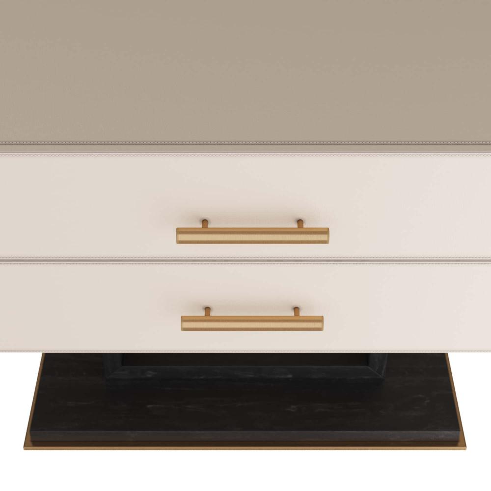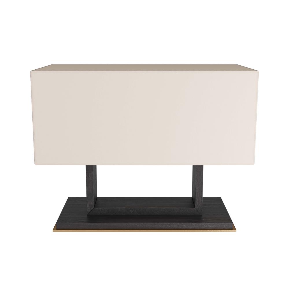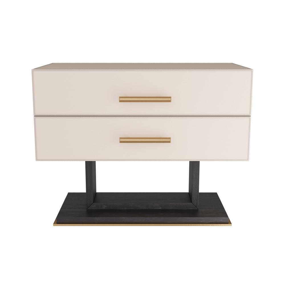 OUR INSPIRED, TWO-DRAWER TATRO SIDE TABLE IS COMPOSED IN AN ARCHITECTURAL DESIGN, WITH A STITCHED, IVORY LEATHER CASE THAT CANTILEVERS OVER AN OPEN PEDESTAL BASE FRAMEWORK OF EBONY OAK, IMPARTING A FLOATING EFFECT. A PLINTH OF OAK AND ANTIQUE BRASS GROUNDS THE STORAGE TABLE, WITH DRAWERS LINED IN CREAM SUEDE. FINISH WILL VARY.