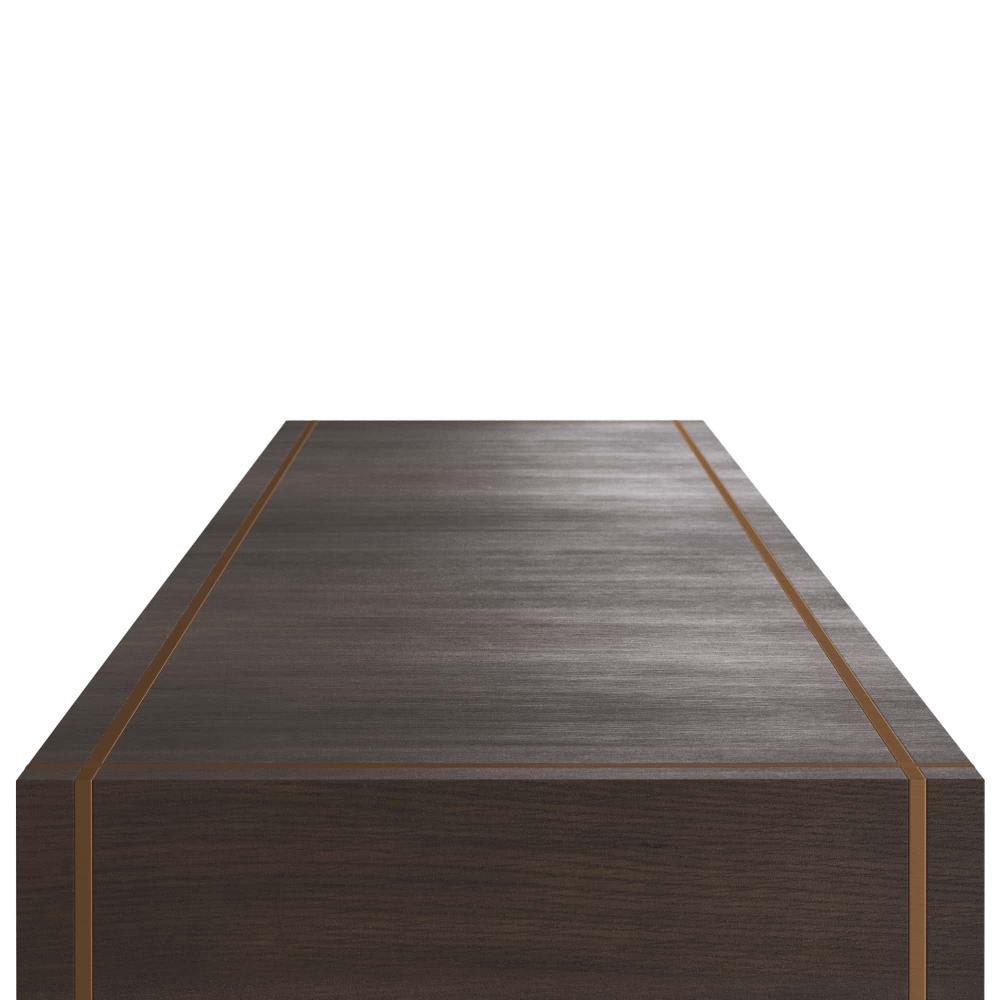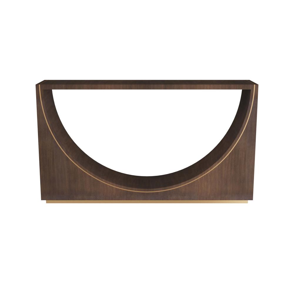CREATED IN A DESIGN THAT PLAYS WITH POSITIVE AND NEGATIVE SPACE, OUR TATTON CONSOLE MAKES A GRAPHIC PRESENTATION. THE PIECE FEATURES AN INVERTED ARCHED UMBER OAK VENEER BASE, WITH AN ANTIQUE BRASS INLAY THAT FOLLOWS THE CURVE OF THE PEDESTAL AND RETURNS ACROSS THE TOP. THE CONSOLE RESTS ATOP AN ANTIQUE BRASS PLINTH. FINISH WILL VARY.