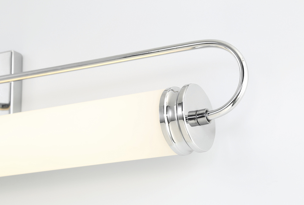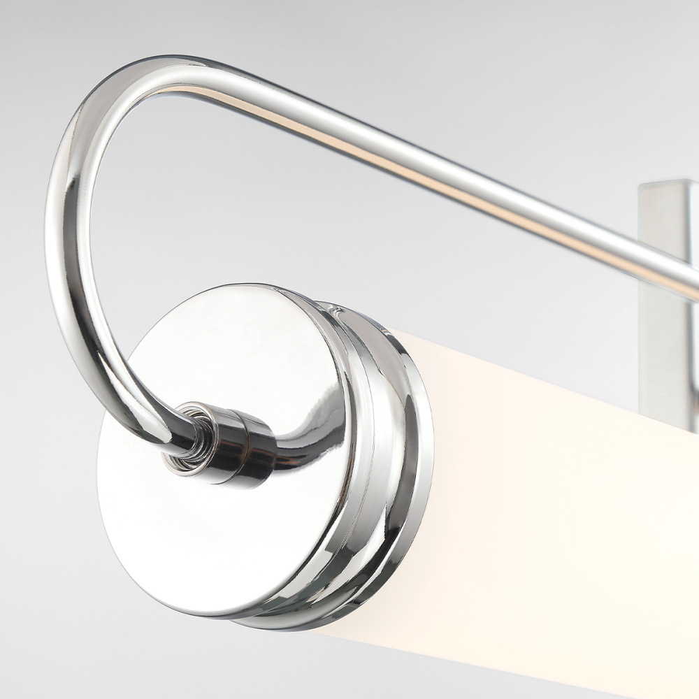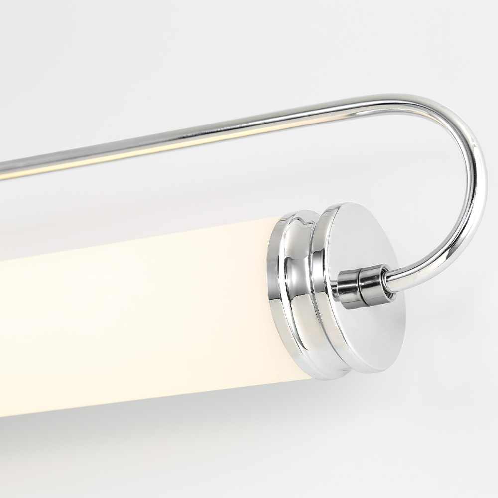 Soft-diffused lighting is presented via a frosted white roll of glass finished with a stepped cap on each end and suspended between embracing racetrack arms. The comfortable illumination whether installed horizontally or vertically will compliment lifestyle settings from contemporary to traditional
