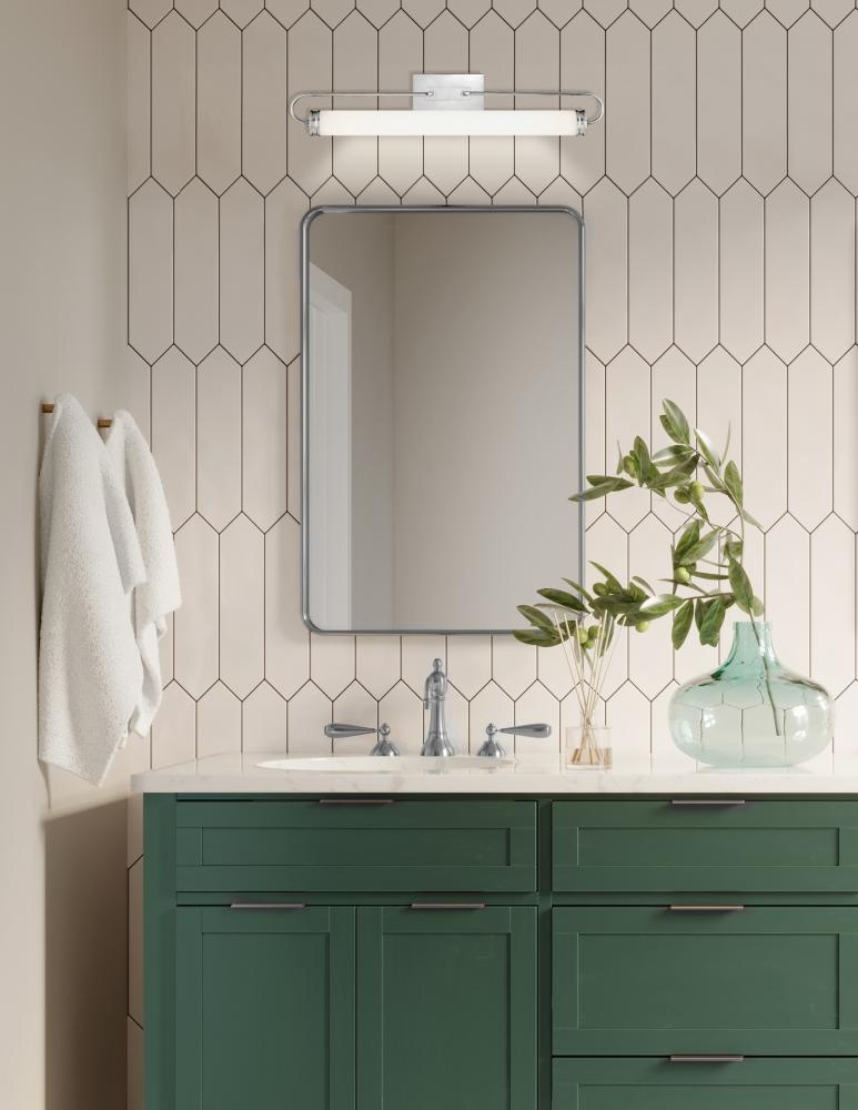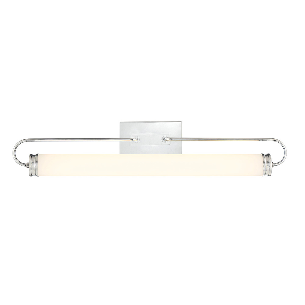 Soft-diffused lighting is presented via a frosted white roll of glass finished with a stepped cap on each end and suspended between embracing racetrack arms. The comfortable illumination whether installed horizontally or vertically will compliment lifestyle settings from contemporary to traditional.