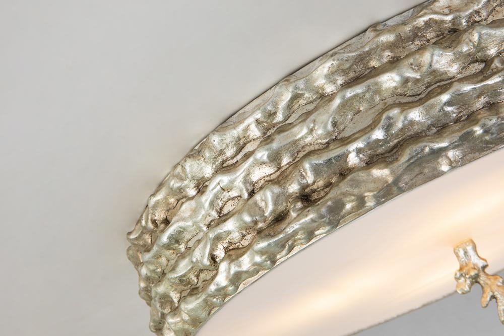 Revel in sophistication with this 20" antique silver flush mount. 4 radiant lights gleam through a textured, hand-painted trellis frame. Frosted glass and a sculpted finial enchant.