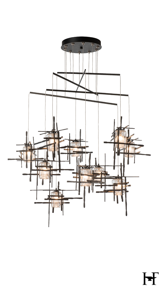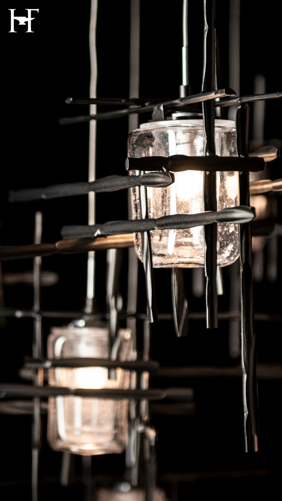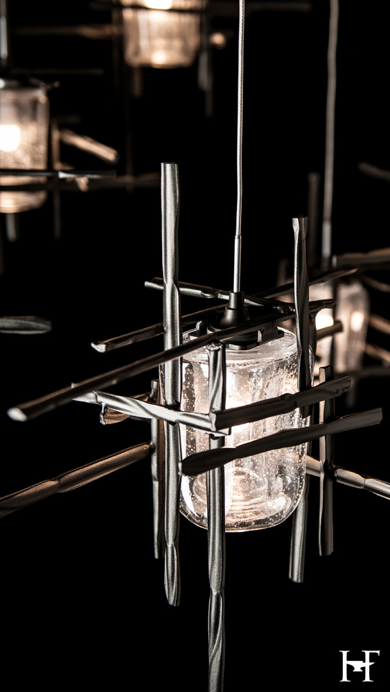 The thick, seeded glass of the Tura is on full display on the Tura's mobile platform. With a unique balance of art and light, the Mobile features delicate metal tubes that guide the cables for a highly-adjustable design, allowing for an expansive reach, all while minimizing the canopy.