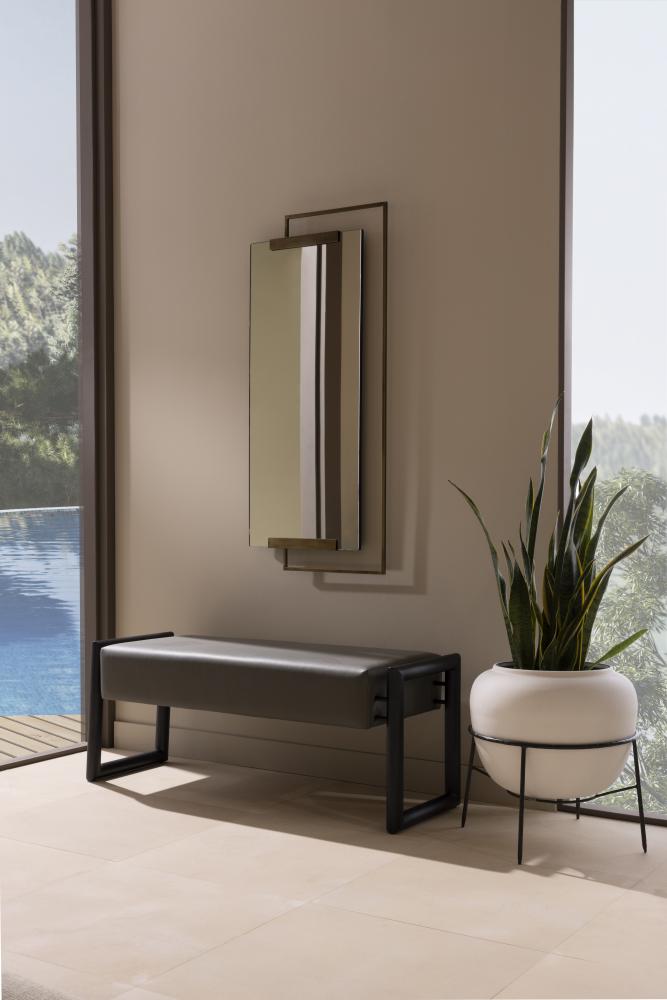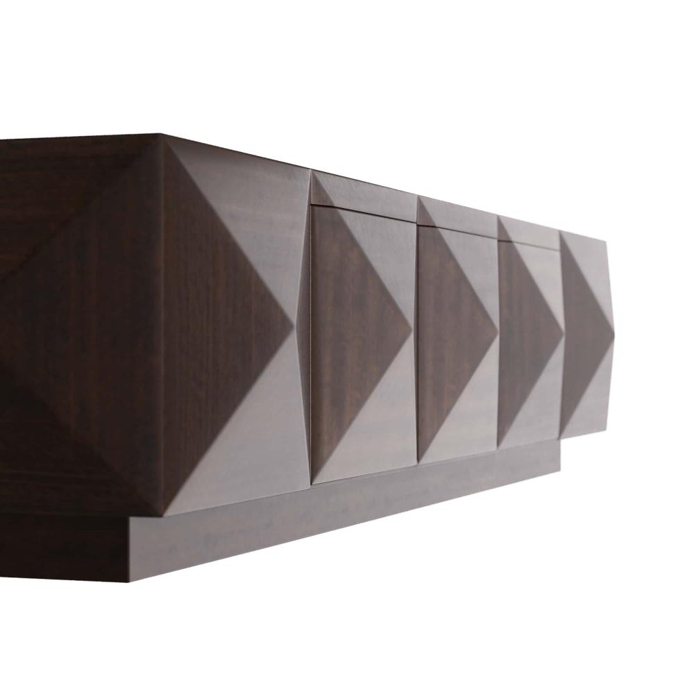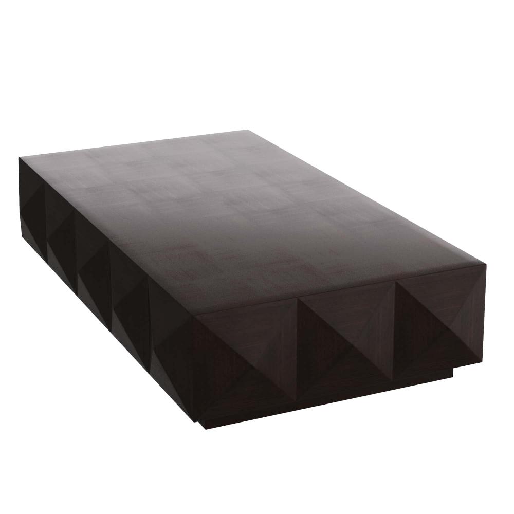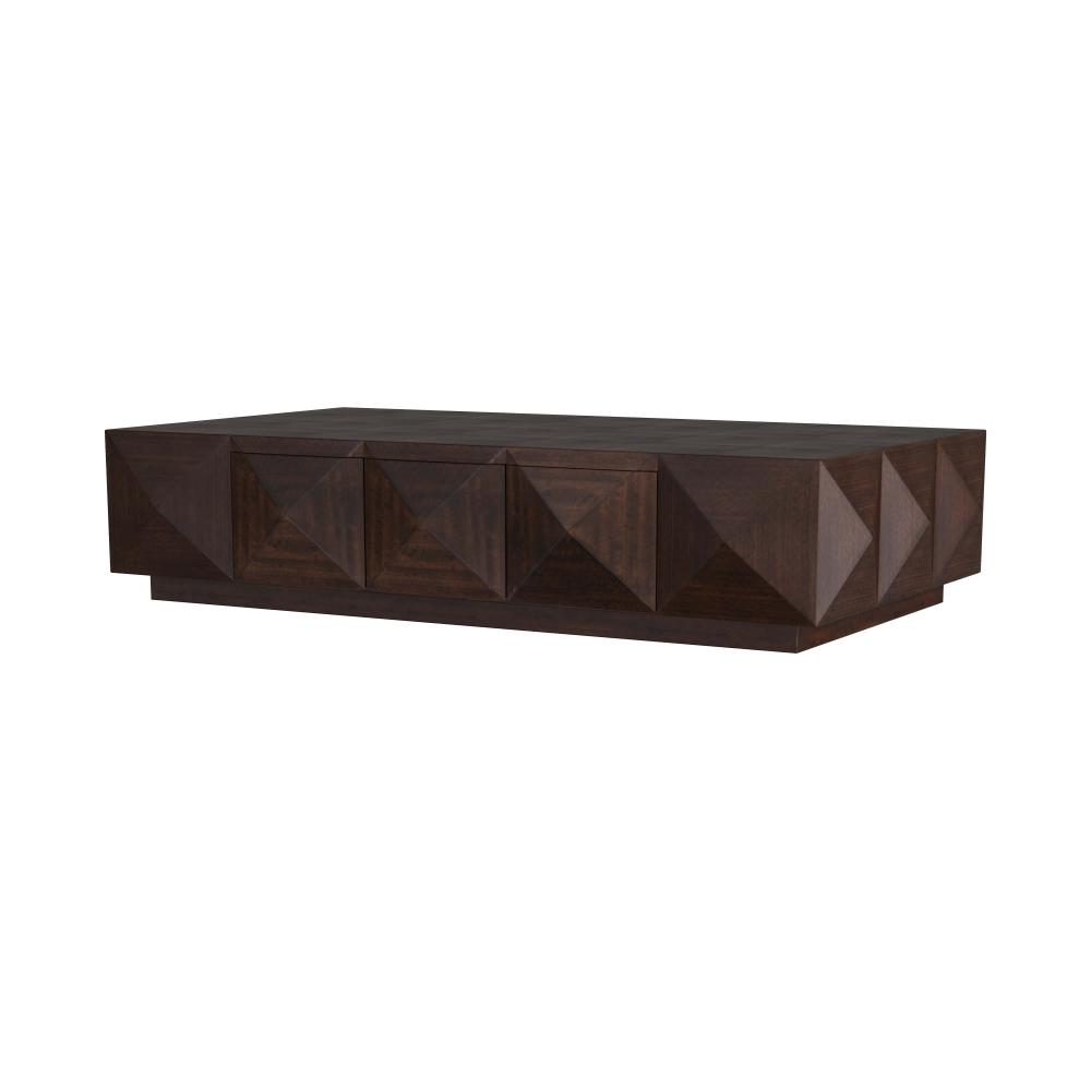 THE MIDCENTURY INFLUENCE IS EASY TO SPOT IN OUR LOW-SLUNG UMBRA COCKTAIL TABLE. THE HANDCRAFTED PIECE—FITTED WITH A HIDDEN DRAWER FOR STORING REMOTES AND THE LIKE—IS DESIGNED WITH A FACETED, STUD-LIKE PERIMETER IN BRINDLE-FINISHED EUCALYPTUS VENEER. CONTRASTING EBONY OAK VENEER FORMS THE TOP TO THE STRIKING TABLE. FINISH WILL VARY.